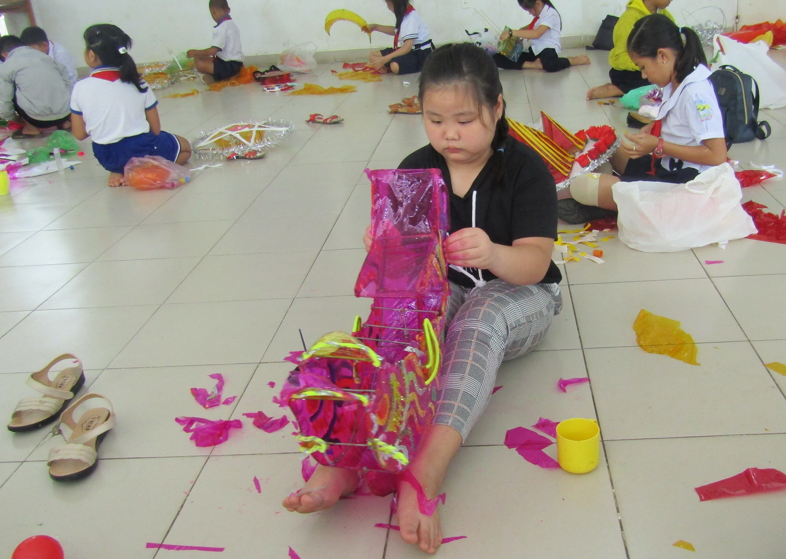 Trổ tài dán lồng đèn (ảnh: Ngọc Bích).