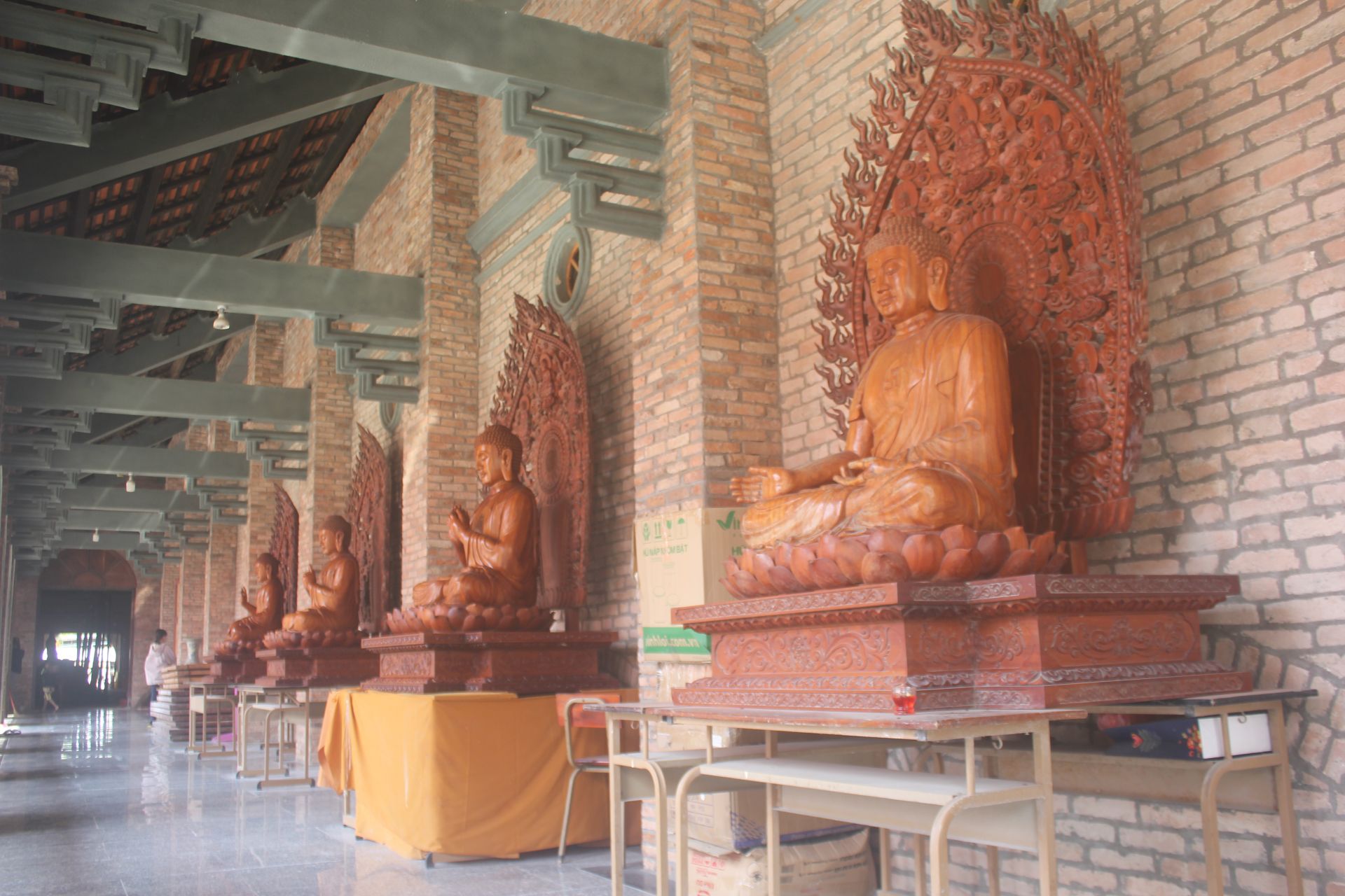 Vẫn là màu nâu của gạch đất nung trên những mảng tường cột ngôi chánh điện cũ dường như vừa được nới rộng ra. Vẫn là mảng tường mặt tiền xưa giống một đầu hồi nhà, thấp thoáng trên cao những đường nét cong màu men xanh ngọc mô tả những rồng, mây, hoa lá…