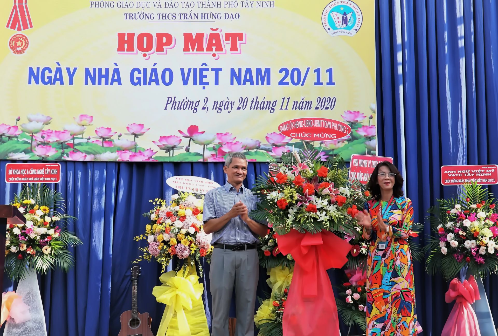 Ông Nguyễn Vĩnh Hưng-Bí thư Đảng ủy Phường 2 (TP.Tây Ninh) tặng hoa chúc mừng nhà trường nhân kỷ niệm Ngày Nhà giáo Việt Nam 20.11