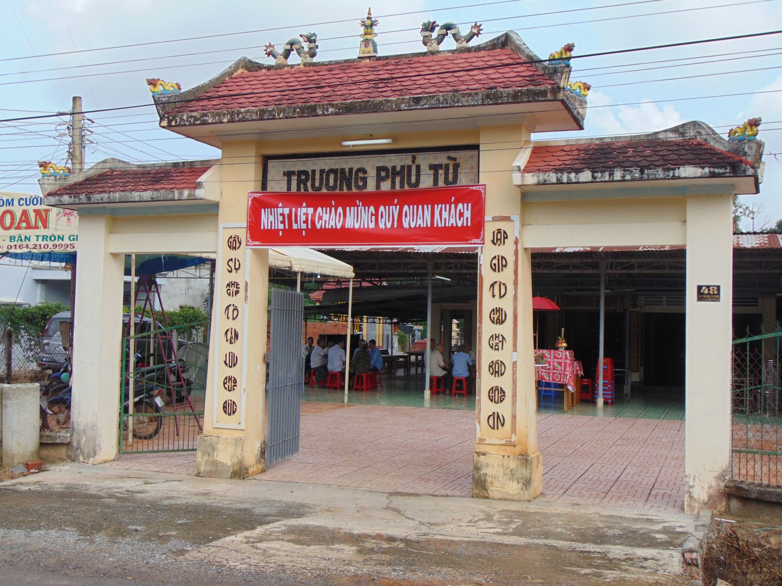 Bên con đường liên ấp Thanh Trung - Thanh Hoà, phần thuộc về ấp Thanh Trung, xã Thanh Ðiền, huyện Châu Thành có một ngôi nhà thờ họ. Ðấy là Trương phủ từ với ba đại tự gắn trên chiếc cổng kiểu tam quan. Trụ cổng xây gạch vuông, hai tầng mái ngói. Trên hai trụ giữa nổi bật đôi câu đối đắp bằng chữ Việt nên dễ đọc: Gầy sự nghiệp, tổ tiên lưu phước đức/ Lập gia tư, cháu chắt báo công ơn.