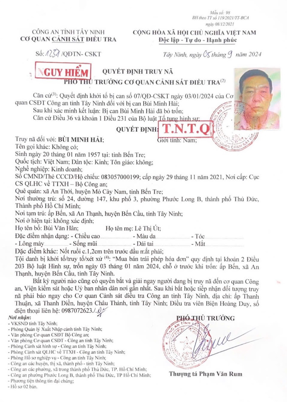 Cơ quan Cảnh sát điều tra Công an tỉnh Tây Ninh đã ra quyết định khởi tố vụ án, khởi tố bị can và ra lệnh bắt bị can tạm giam đối với bị can Bùi Minh Hải về tội “Mua bán trái phép hoá đơn” theo quy định tại khoản 2 Điều 203 Bộ luật Hình sự nhưng bị can Hải đã bỏ trốn, Cơ quan Cảnh sát điều tra Công an tỉnh Tây Ninh đã ra Quyết định truy nã số 1237 /QĐTN-CSKT ngày 5.9.2024 đối với bị can Bùi Minh Hải.