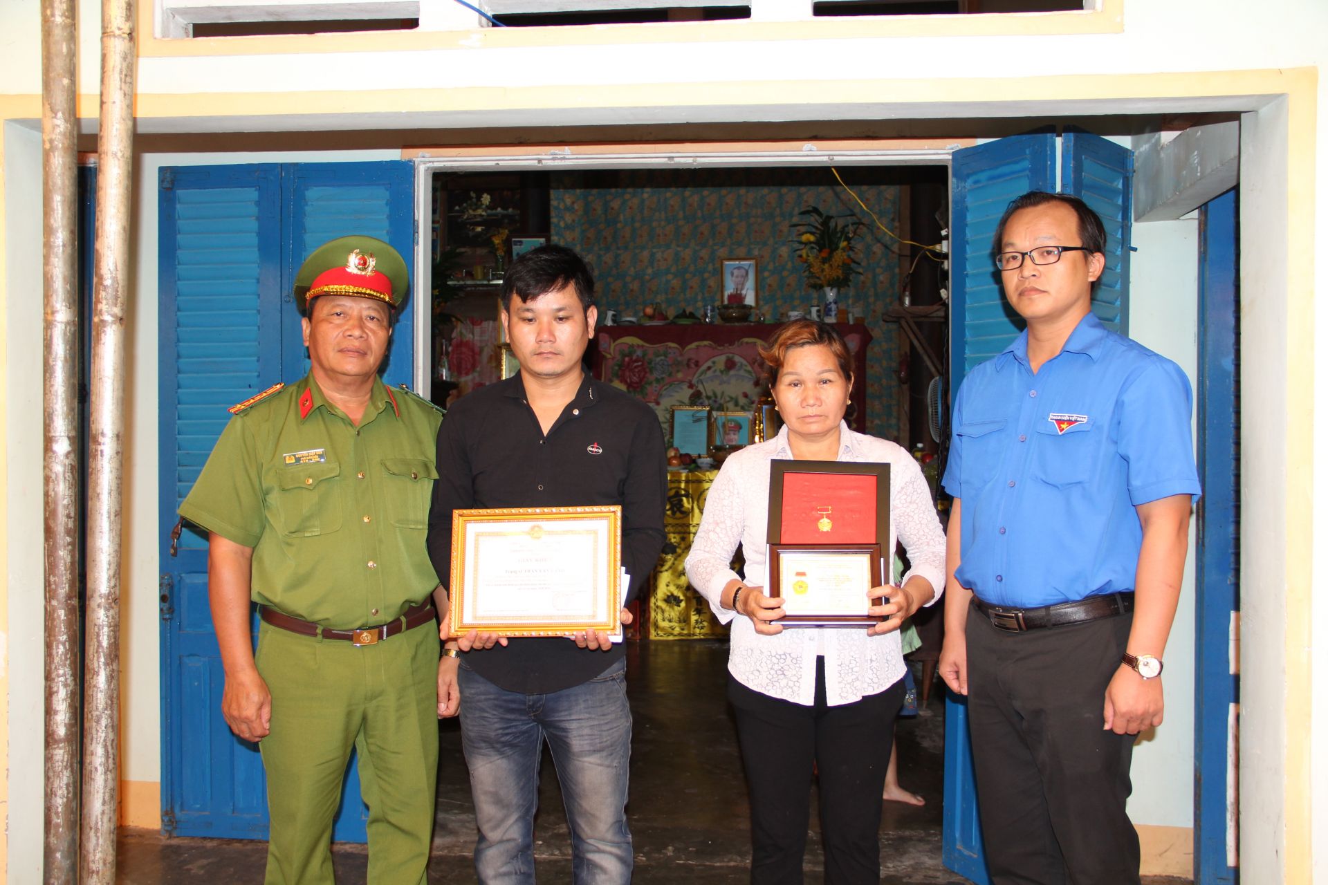 Đại tá Nguyễn Hiệp Sơn- Phó Giám đốc CA tỉnh và Phó Bí thư Tỉnh đoàn Võ Quốc Khánh trao Huy hiệu Tuổi trẻ dũng cảm cho người thân Trung sĩ Trần Văn Lành.