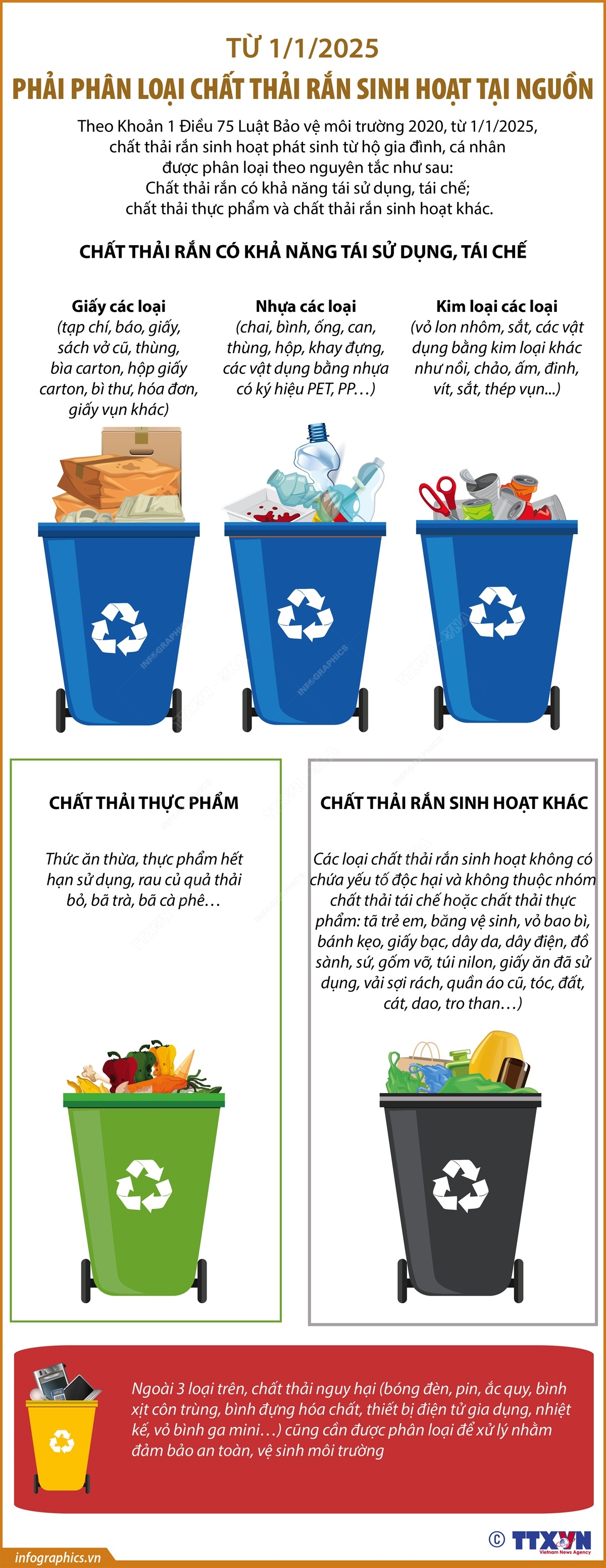 Theo Khoản 1 Điều 75 Luật Bảo vệ môi trường 2020, từ 1/1/2025, Chất thải rắn sinh hoạt phát sinh từ hộ gia đình, cá nhân được phân loại theo nguyên tắc như sau: Chất thải rắn có khả năng tái sử dụng, tái chế; Chất thải thực phẩm và Chất thải rắn sinh hoạt khác.