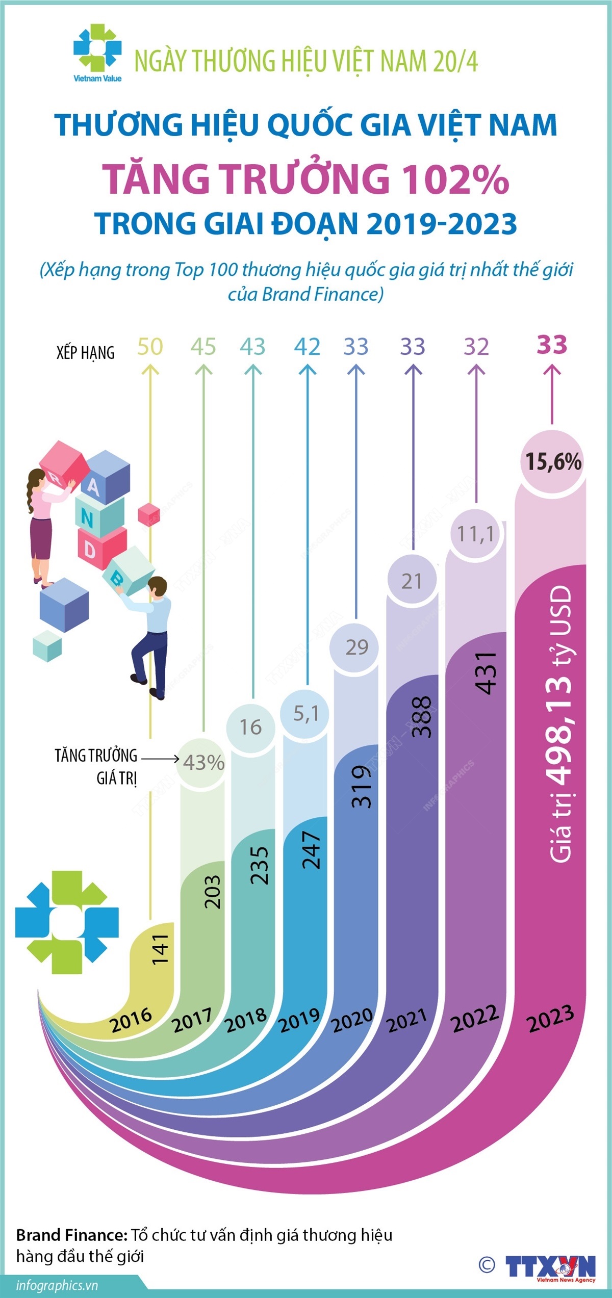 Theo đánh giá của Tổ chức tư vấn định giá thương hiệu hàng đầu thế giới - Brand Finance, thương hiệu quốc gia Việt Nam có tốc độ tăng trưởng 102% trong giai đoạn 2019-2023. Giá trị thương hiệu quốc gia năm 2023 đạt 498,13 tỷ USD, tăng 15,6% so với năm 2022, xếp thứ 33/121 thương hiệu quốc gia mạnh trên thế giới được xếp hạng.