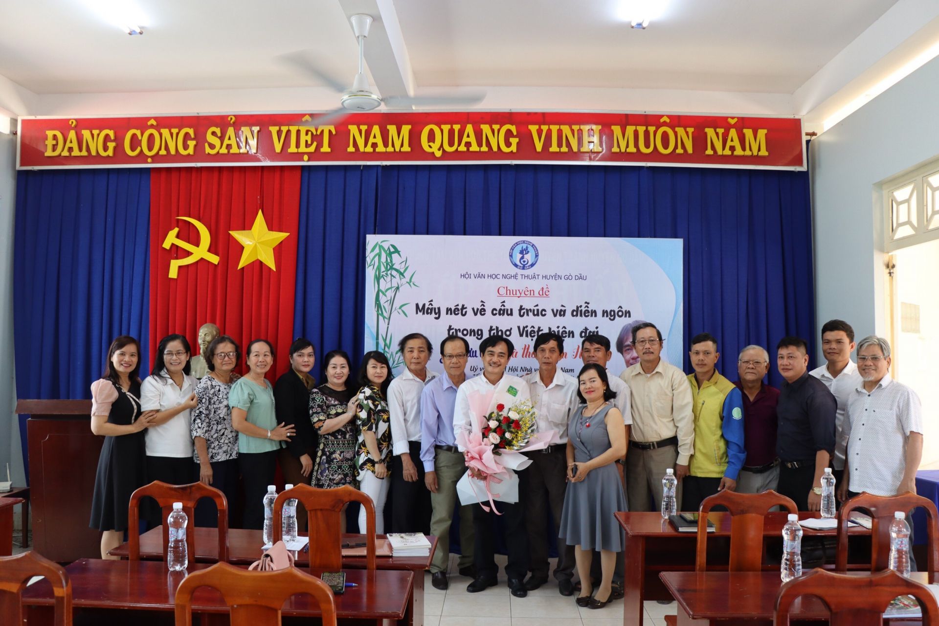 Văn nghệ sĩ Hội VH-NT Gò Dầu chụp ảnh lưu niệm cùng nhà thơ Phan Hoàng tại buổi sinh hoạt chuyên đề.