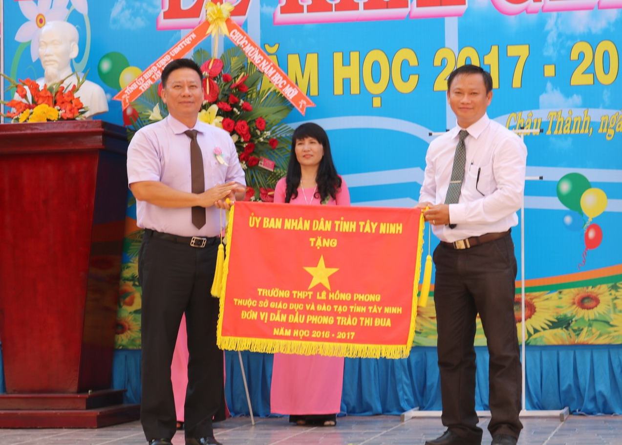Tại buổi lễ, Trường THPT Lê Hồng Phong được UBND tỉnh Tây Ninh trao cờ đơn vị dẫn đầu phong trào thi đua năm học 2016 – 2017.