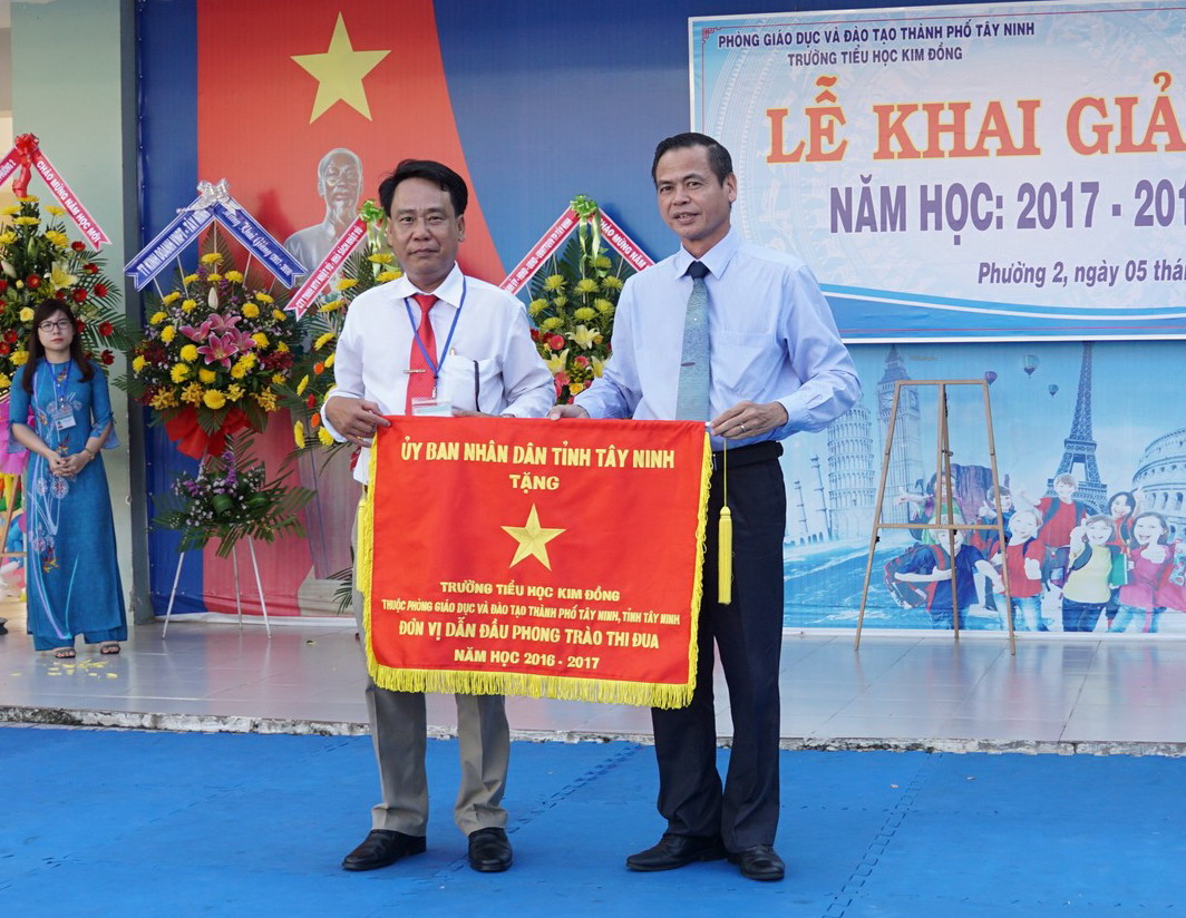 Tại lễ khai giảng, Bí thư thành uỷ Trần Hữu Hậu đã trao cờ Đơn vị dẫn đầu phong trào thi đua năm học 2016-2017 cho tập thể trường Tiểu học Kim Đồng.