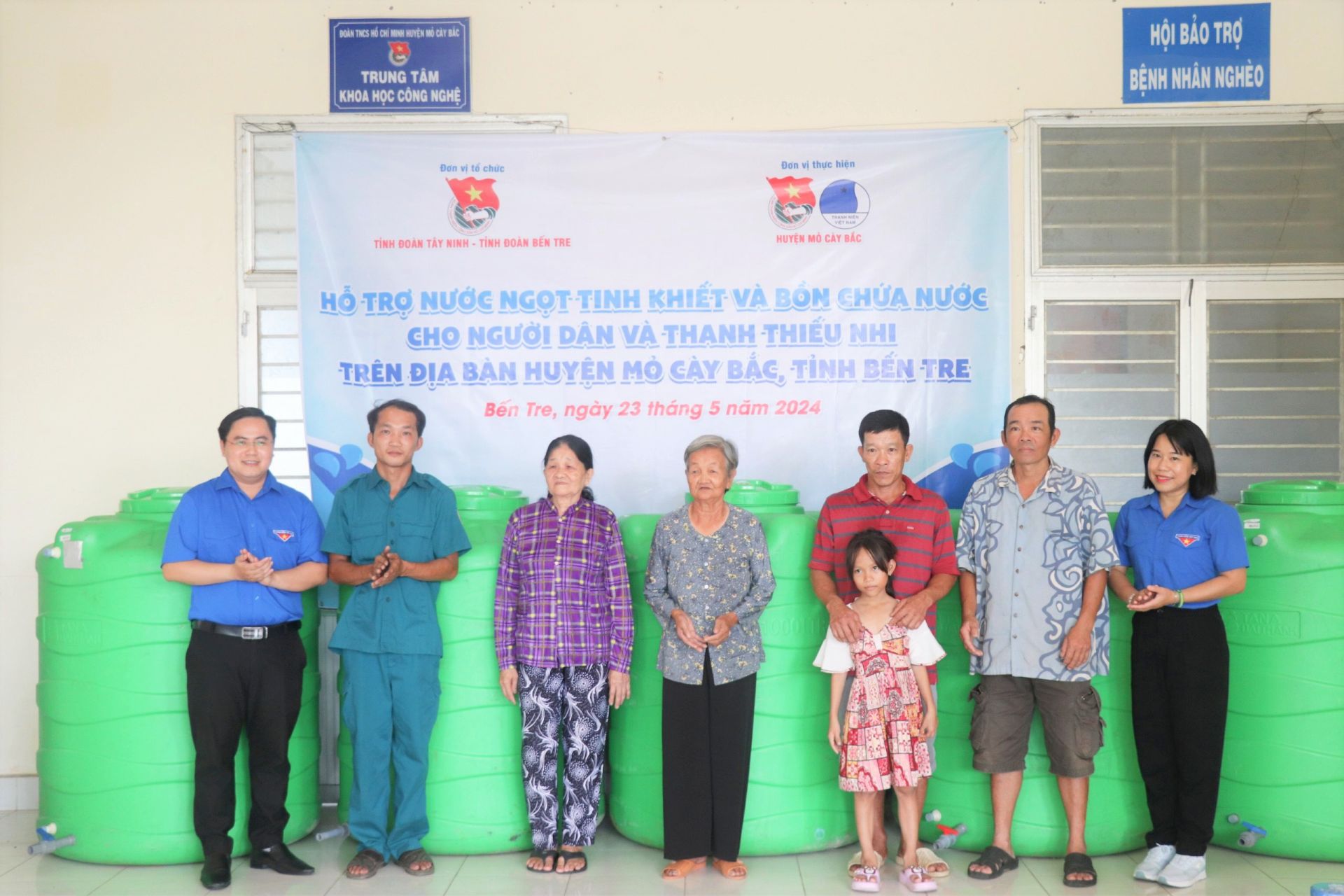 Tỉnh đoàn Tây Ninh và Tỉnh đoàn Bến Tre trao tặng bồn chứa nước và nước ngọt cho hộ gia đình khó khăn trên địa bàn xã Tân Phú Tây, huyện Mỏ Cày Bắc.