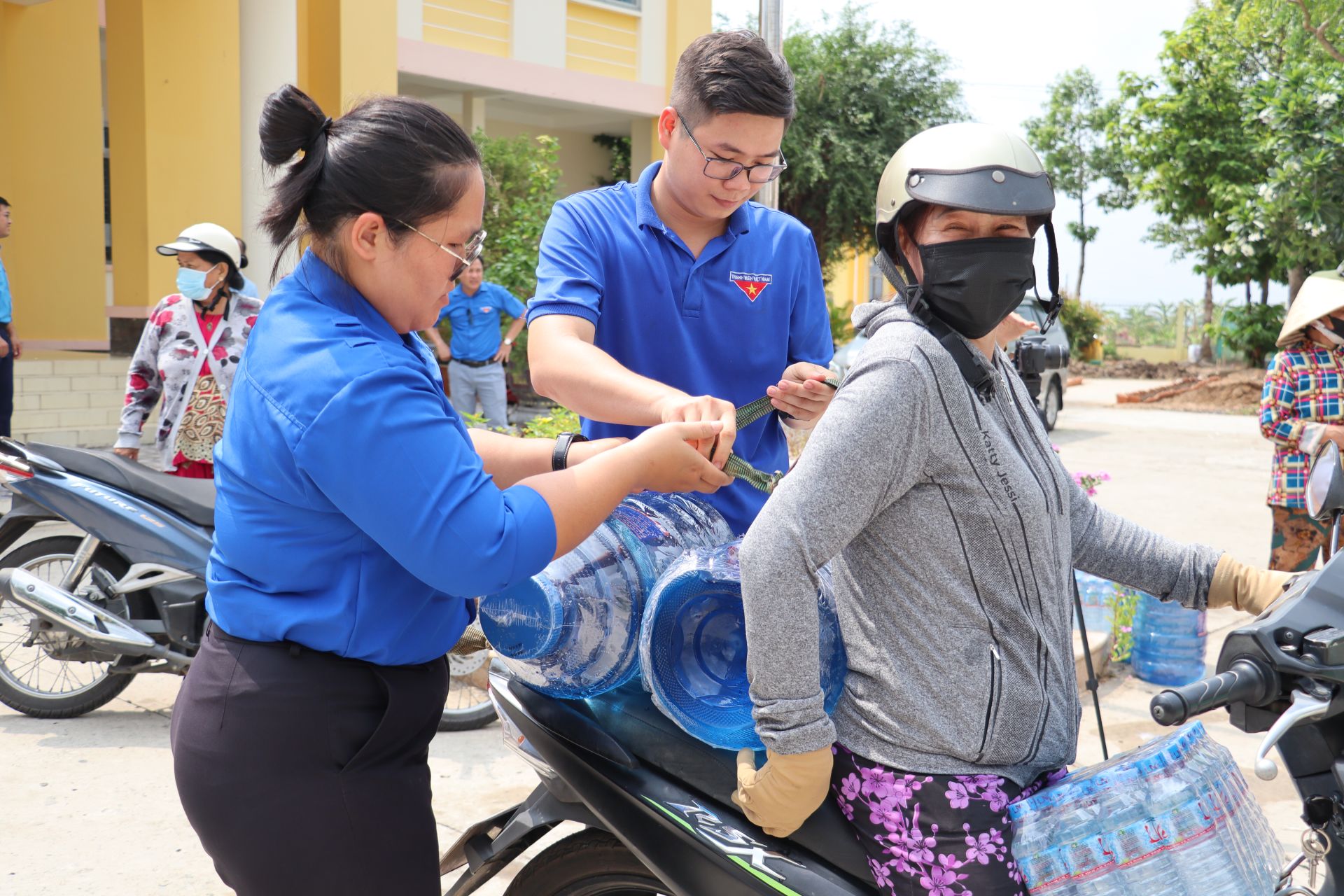Đoàn viên thanh niên Tây Ninh giúp người dân vận chuyển nước về nhà.