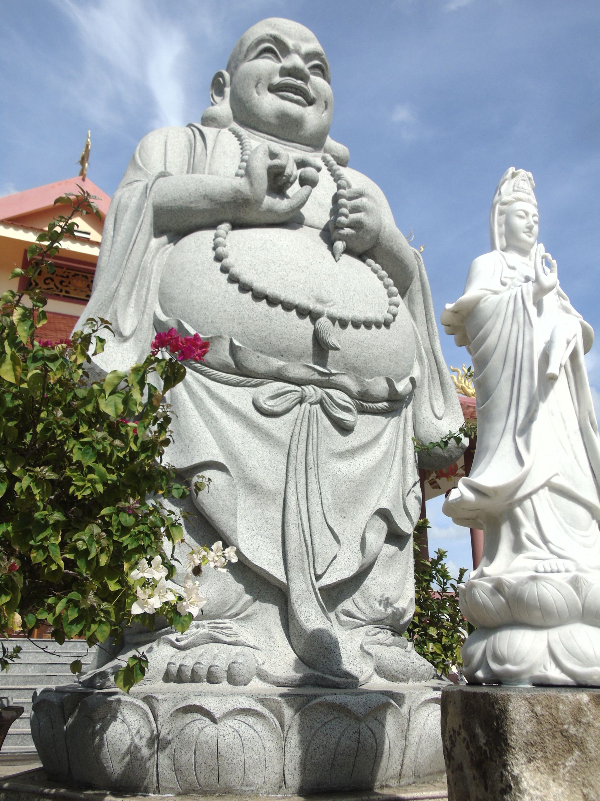 Ở pho A Di Đà hay Di Lặc cũng vậy. Hình tượng ngài Di Lặc đã quá quen thuộc với người Việt ở cái bụng lớn chứa đầy sự bao dung, gương mặt cười khoáng đạt và cởi mở; thì tượng ở chùa Hạnh Lâm vẫn có một nét riêng gì đó, vừa rất dân gian Nam bộ, vừa mang thần thái tự tại ung dung ban phúc lộc tới muôn nhà. Nhìn kỹ mà xem, trên má ngài là 2 lúm đồng tiền. Và cánh tay với bàn tay lần tràng hạt ấy như thể đang phập phồng những đường gân hay mạch máu dưới làn da đá.