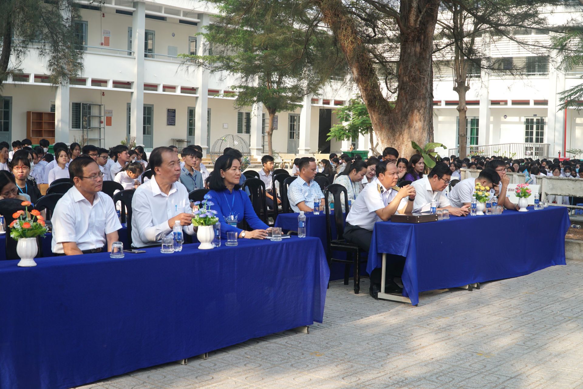 Dự hội nghị có Trung tá Phạm Đức Lợi- Chủ nhiệm Chính trị trường Cao đẳng Kỹ thuật Hải quân, ông Phạm Văn Tín- Phó trưởng Ban Tuyên giáo Tỉnh uỷ, cùng ban giám hiệu, thầy cô giáo và gần 1.400 học sinh trường THPT Nguyễn Trãi.