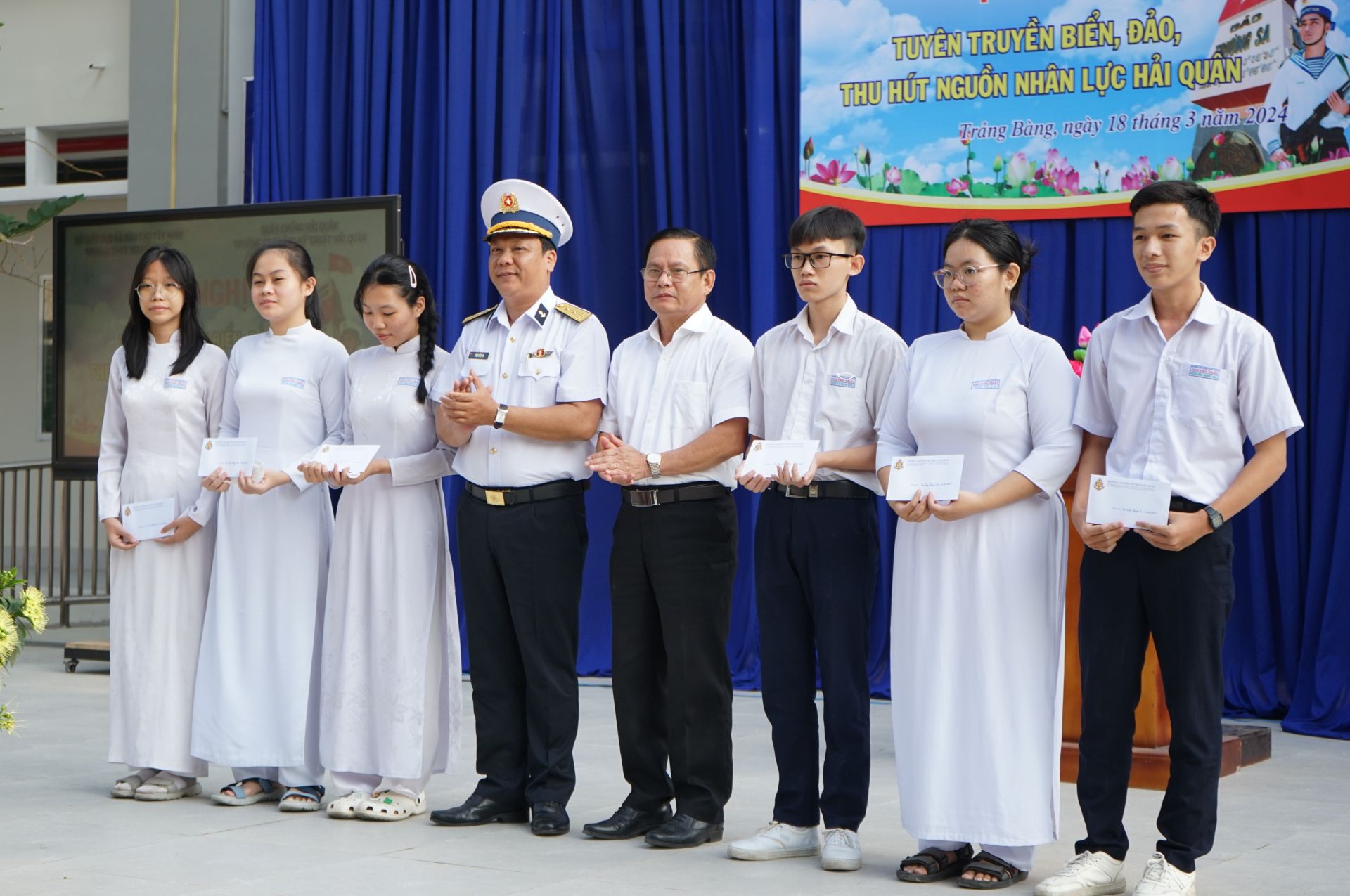 Sáng cùng ngày, trường Cao đẳng Kỹ thuật Hải quân phối hợp với Ban Tuyên giáo Tỉnh uỷ tổ chức hội nghị tuyên truyền biển, đảo, thu hút nguồn lực Hải quân năm 2024 tại các trường THPT Quang Trung, Ngô Gia Tự (huyện Gò Dầu) và THPT Trảng Bàng, đồng thời trao 18 suất học bổng cho học sinh vượt khó, học giỏi tại 3 trường nêu trên.