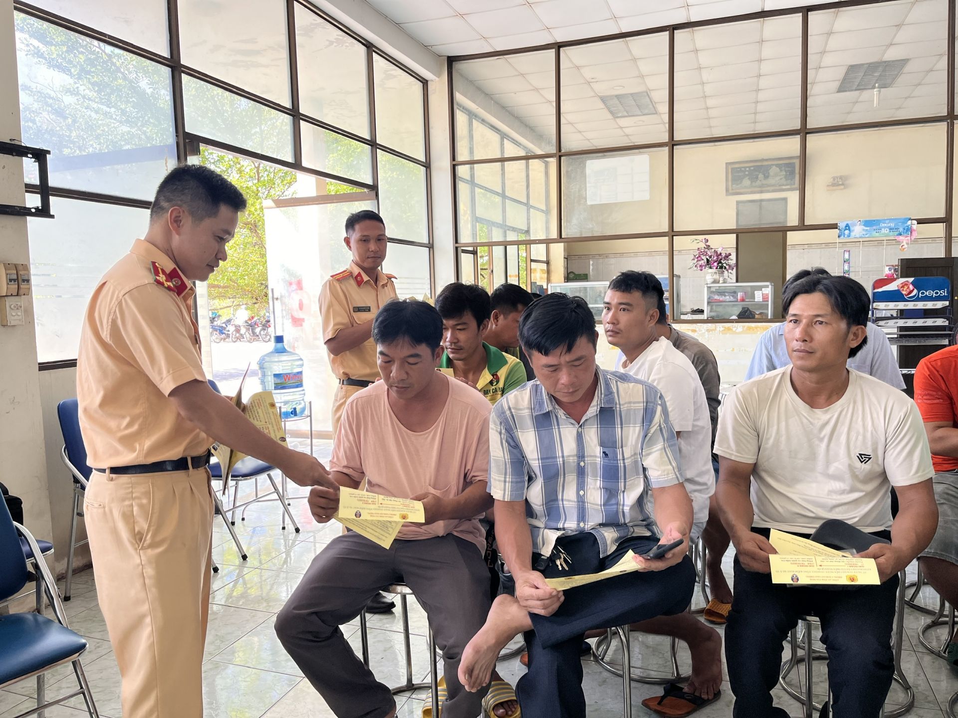 Phát tờ rơi tuyên truyền pháp luật cho người điều khiển xe ô tô vận tải hàng hoá.