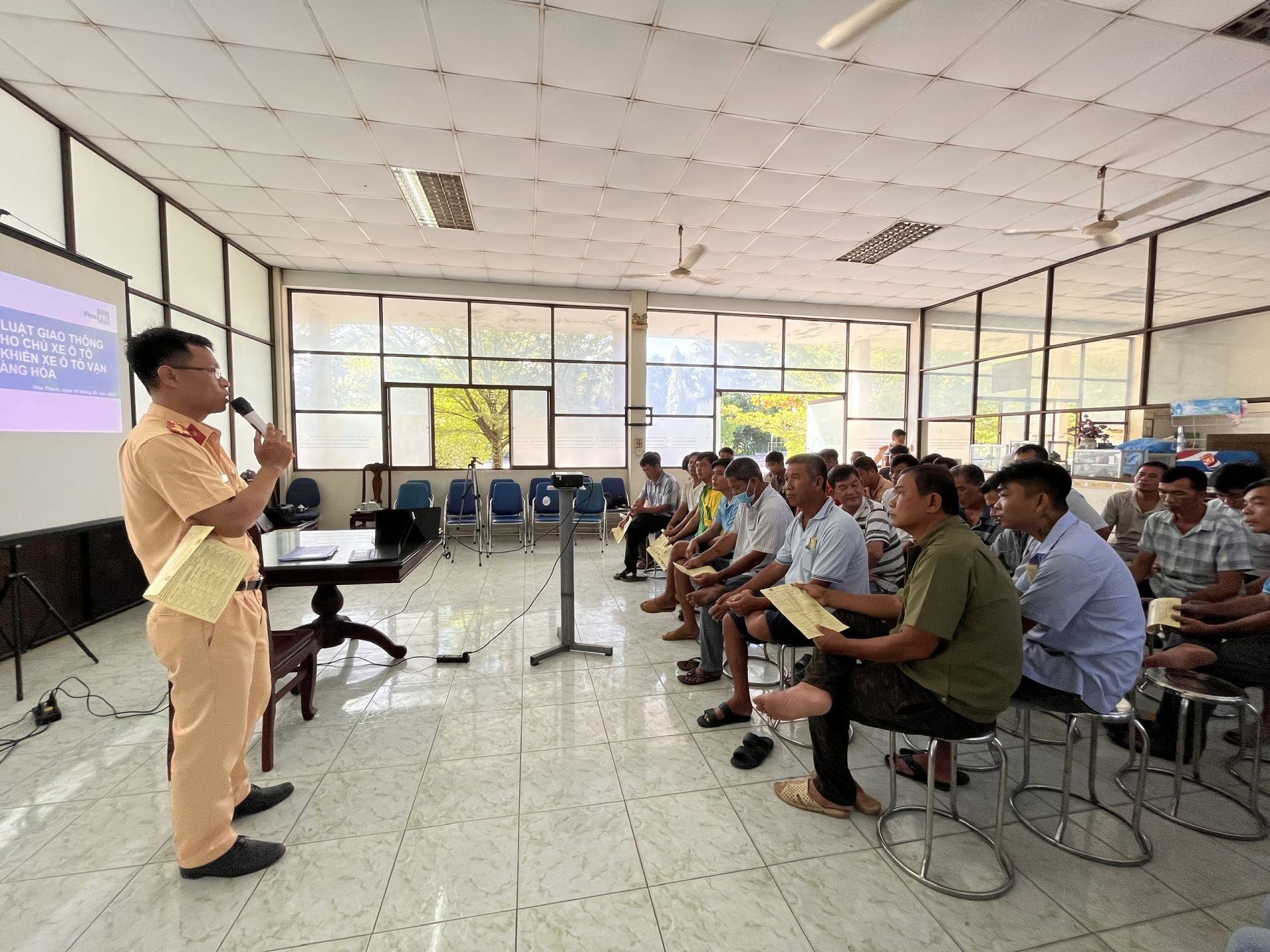 Ngày 10.8, Phòng Cảnh sát giao thông, Công an tỉnh phối hợp Đội Cảnh sát giao thông - trật tự, Công an thị xã Hoà Thành tuyên truyền Luật Giao thông đường bộ cho chủ xe ô tô và người điều khiển xe ô tô vận tải hàng hoá tại cảng Bến Kéo, Công ty CP xi măng Fico Tây Ninh.