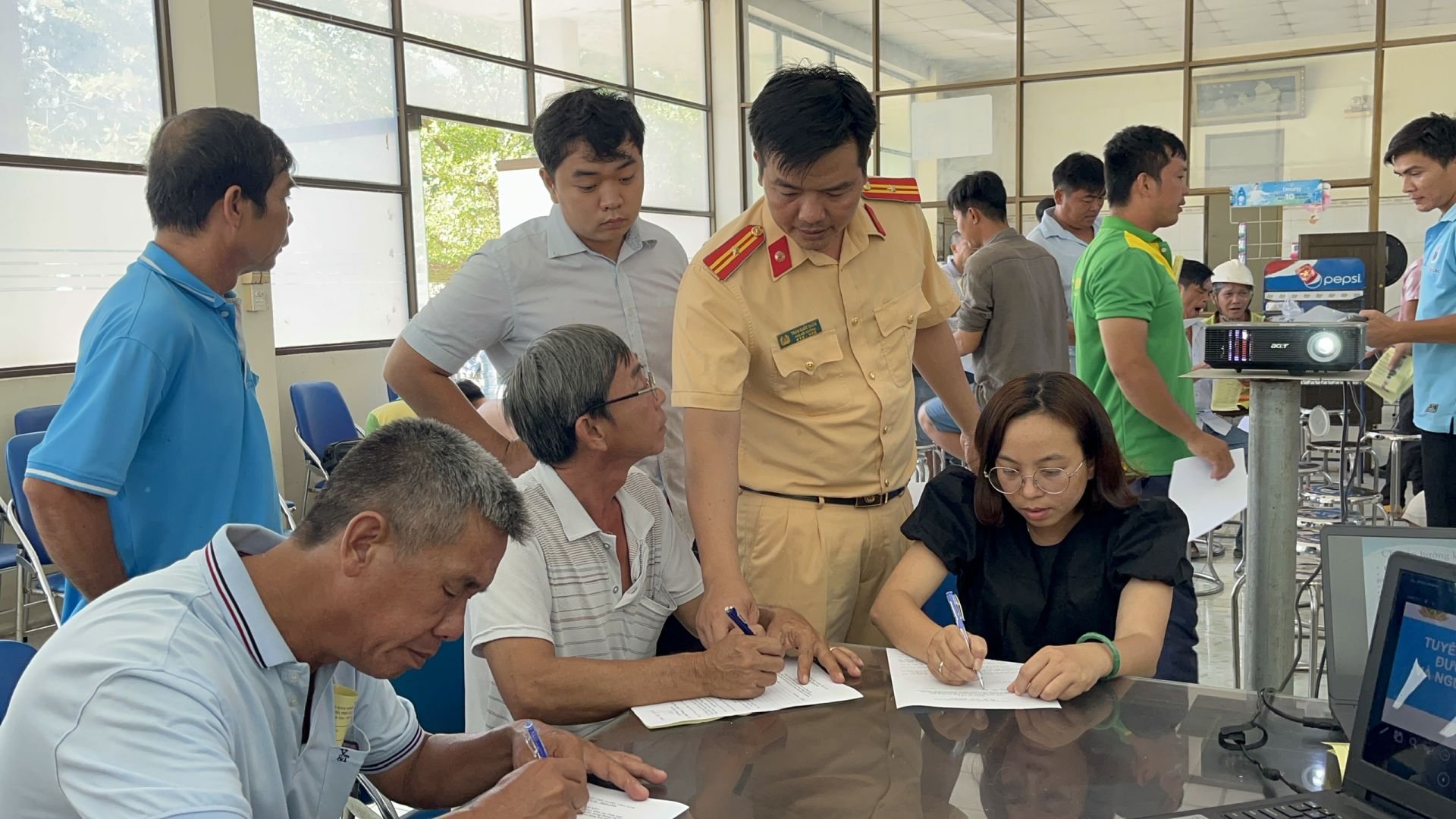 Ngoài việc tuyên truyền trực tiếp, cán bộ Cảnh sát giao thông còn phát tờ rơi và vận động chủ xe ô tô và người điều khiển xe ô tô vận tải hàng hoá ký cam kết chấp hành nghiêm các quy định của pháp luật trong bảo đảm trật tự an toàn giao thông đường bộ.