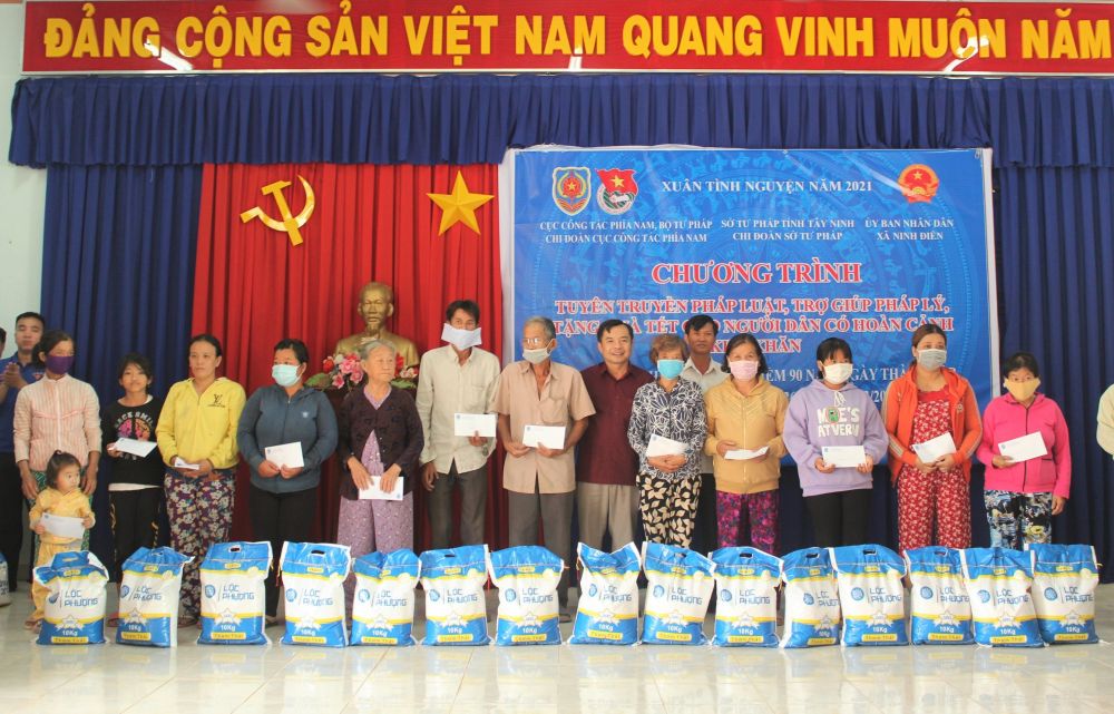 Nhân dịp này, Chi đoàn Cục Công tác phía Nam và Sở Tư pháp Tây Ninh đã quyên góp, vận động ủng hộ 80 phần quà tết cho các cá nhân hoặc đại diện hộ gia đình có hoàn cảnh đặc biệt khó khăn, người già neo đơn, gia đình chính sách và 20 phần quà cho học sinh nghèo vượt khó, học giỏi. Mỗi phần quà trị giá 650.000 đồng (bao gồm 500.000 đồng tiền mặt và 10 kg gạo), tổng số tiền hơn 65 triệu đồng.