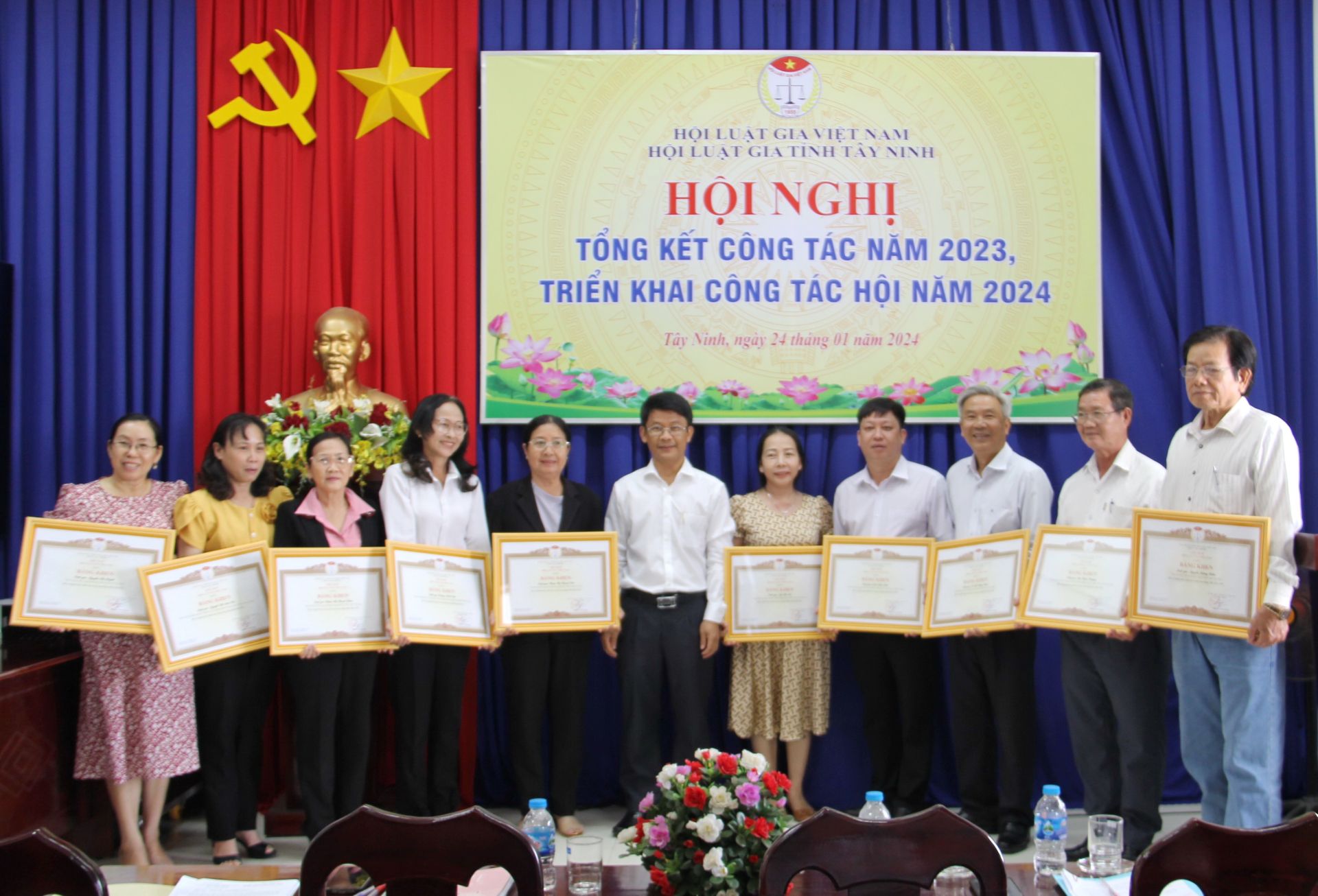 Ông Hồ Thành Hiên- Phó trưởng Ban Nội Chính Tỉnh uỷ trao bằng khen của UBND tỉnh cho Hội Luật gia TP. Tây Ninh, Hội Luật gia huyện Gò Dầu, Chi hội Luật gia Văn phòng Hội Luật gia tỉnh, Chi hội Luật gia Công an tỉnh, Chi hội Luật gia Sở Tư pháp đã có thành tích xuất sắc trong hoạt động năm 2023. Lãnh đạo Hội Luật gia tỉnh cũng trao bằng khen của Hội Luật gia Việt Nam và giấy khen của Hội Luật gia tỉnh cho các tập thể, cá nhân có thành tích trong công tác Hội năm 2023.