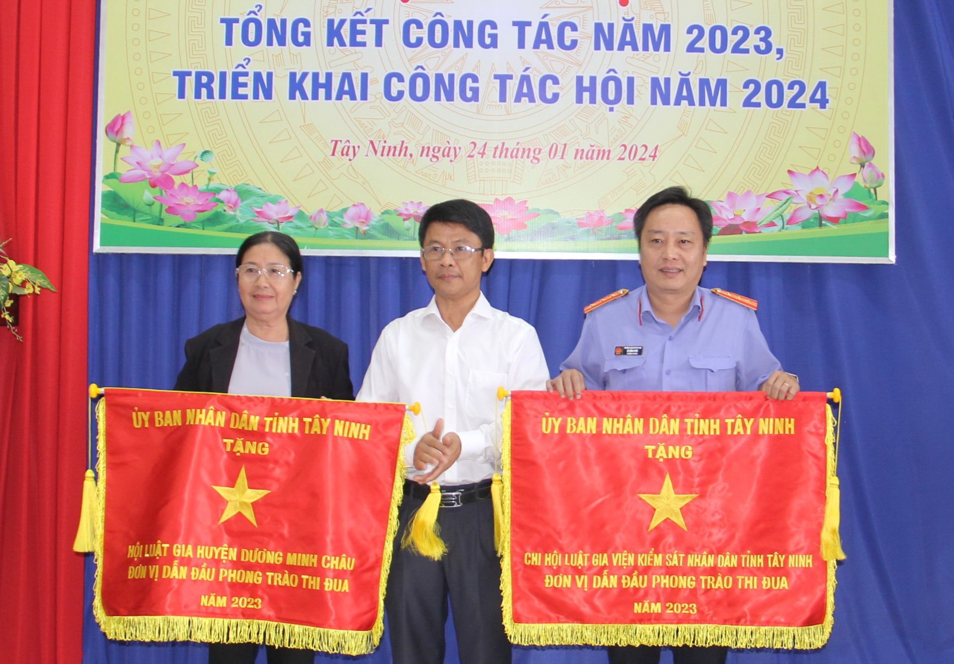 Nhân dịp này, Giám đốc Sở Tư pháp, Chủ tịch Hội Luật gia tỉnh Tây Ninh Phạm Văn Đặng trao cờ “Đơn vị dẫn đầu phong trào thi đua” năm 2023 của Chủ tịch UBND tỉnh cho Hội Luật gia huyện Dương Minh Châu, Chi hội Luật gia Viện KSND tỉnh.