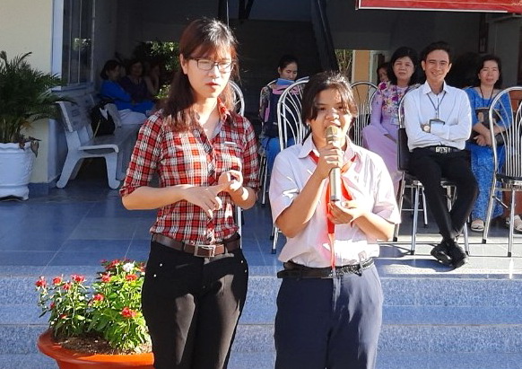 Các em học sinh Trường THCS Trường Hoà tham gia trả lời câu hỏi về phòng chống bạo lực học đường.