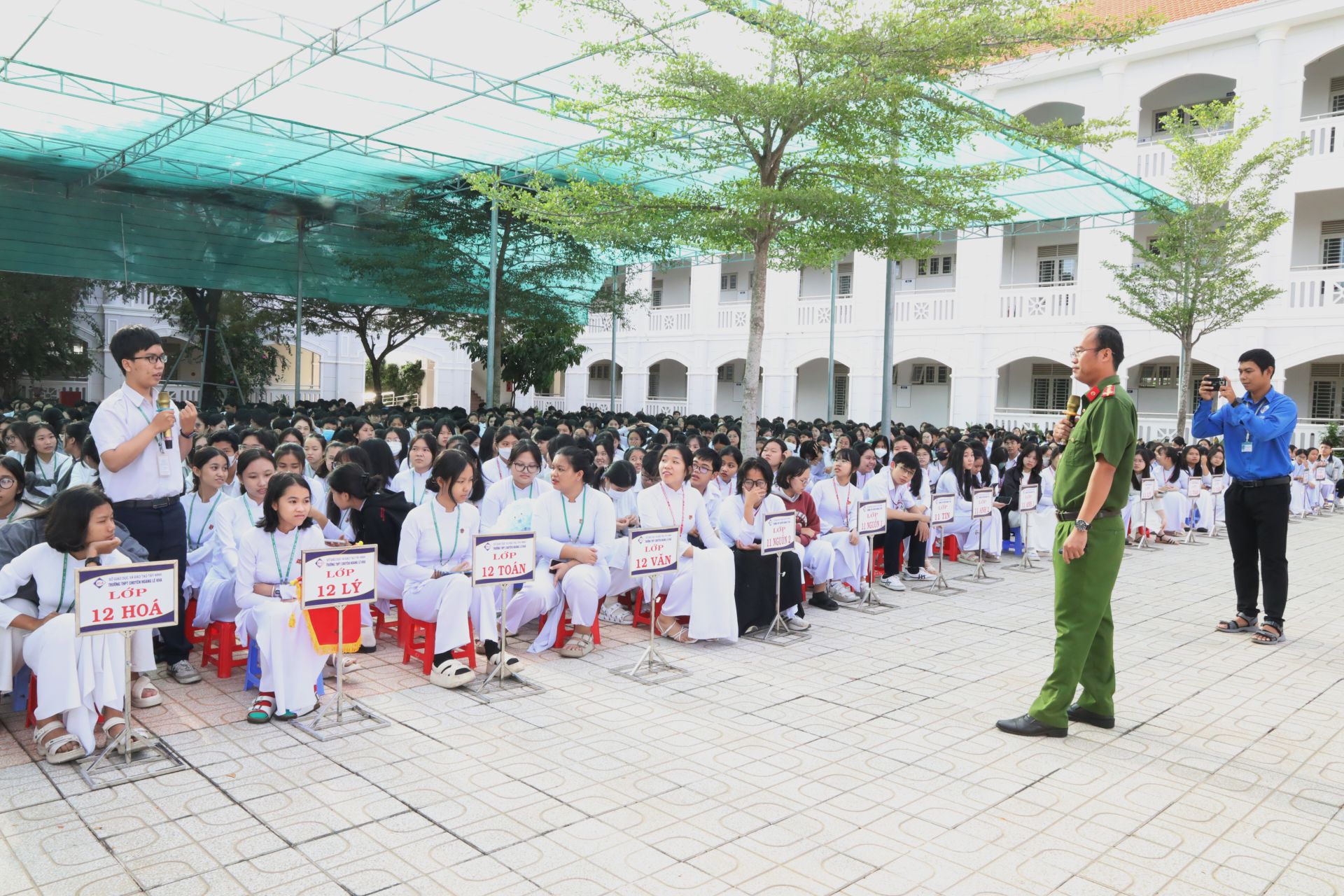 Đại úy Trần Thanh Thắng, giảng viên Khoa Cảnh sát điều tra tội phạm về ma túy, Trường Đại học Cảnh sát nhân dân, thông tin đến các em học sinh và giáo viên về tình hình, kết quả công tác đấu tranh phòng, chống tội phạm về ma túy cũng như tác hại của tệ nạn ma túy đến xã hội; cách nhận biết các loại ma túy tổng hợp mà các đối tượng mua bán, sử dụng phổ biến hiện nay; tác hại của thuốc lá điện tử.