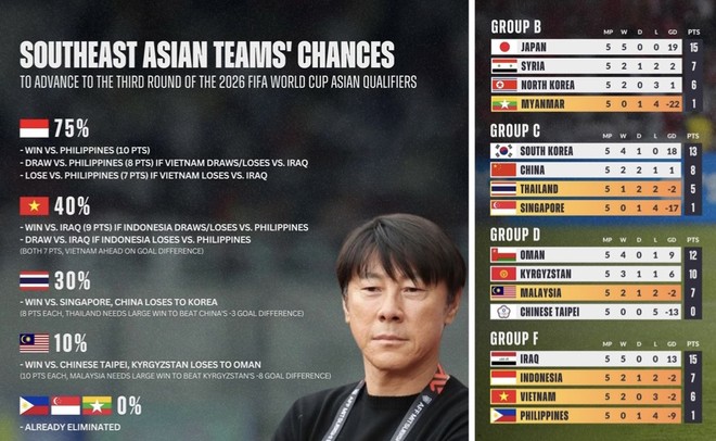 Trong 4 đại diện Đông Nam Á còn khả năng đi tiếp vòng loại World Cup 2026, trang SEASIA Goal lần lượt xếp Indonesia 70%, Việt Nam 40%, Thái Lan 30% và Malaysia 10%.