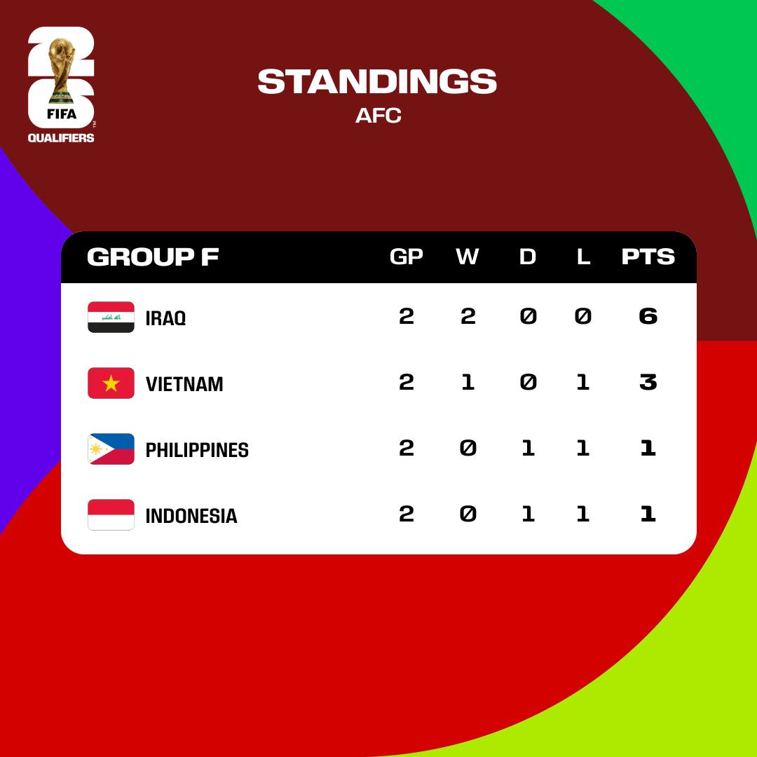 Trước hai trận đấu quan trọng với Indonesia, Đội tuyển Việt Nam đang xếp thứ hai bảng F với 3 điểm, kém đội dẫn đầu Iraq 3 điểm. Điều này cũng đồng nghĩa với việc thầy trò Huấn luyện viên Philippe Troussier sẽ giành cơ hội lớn để thẳng tiến vào Vòng loại thứ Ba World Cup 2026 nếu đánh bại Indonesia cả hai lượt trận.