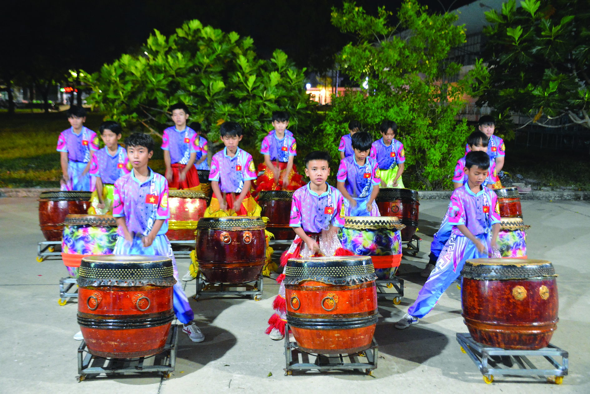 Ở tiết mục này, tuy không có sự góp mặt của các chú lân nhưng âm thanh phát ra từ dàn trống luôn mang đến không khí sôi động. Tuỳ theo không gian và yêu cầu của khách hàng mà các đoàn có thể sử dụng từ 6 đến 18 chiếc trống cùng một lúc. Theo kinh nghiệm của người trong nghề, những chiếc trống cũng phải trải qua 2-3 năm mới có thể đạt tần số âm thanh hay nhất.