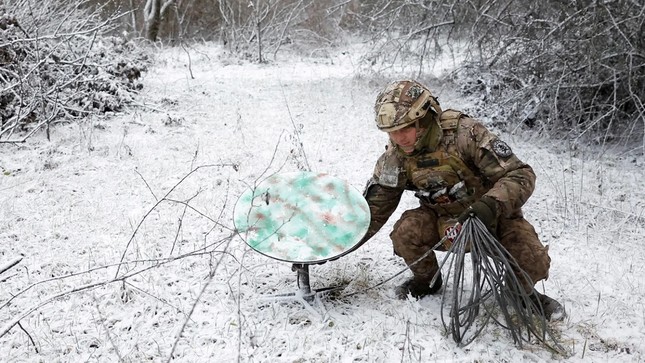 Một binh sĩ Ukraine ngắt kết nối Starlink. Ảnh: Reuters