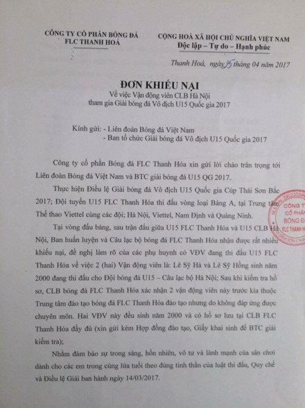 Đơn khiếu nại của đội Thanh Hóa về việc U 15 Hà Nội có hai cầu thủ lố tuổi là Lê Sỹ Hồng và Lê Sỹ Hà.