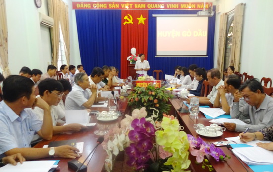 Ông Nguyễn Văn Nhu-Chủ tịch UBND huyện chủ trì cuộc họp; cùng tham dự có bà Nguyễn Thị Thanh Nhàn-Phó Bí thư Thường trực Huyện ủy Gò Dầu.