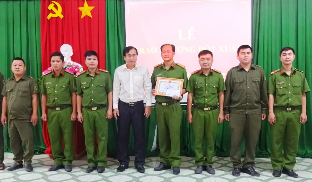 Ông Nguyễn Văn Nhu-Chủ tịch UBND huyện Gò Dầu khen thưởng đột xuất cho tập thể Công an xã Phước Đông.