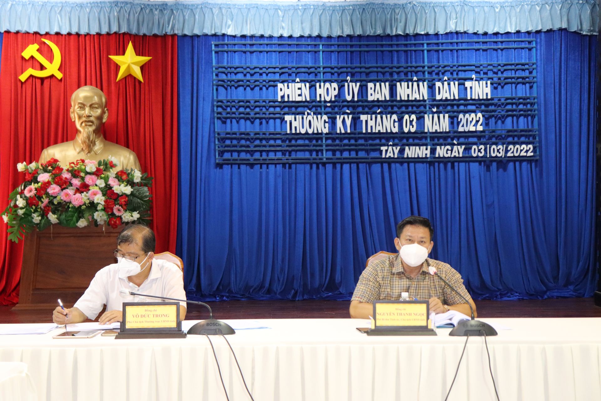 Sáng 3.3, UBND tỉnh tổ chức phiên họp thường kỳ tháng 3.2022. Chủ tịch UBND tỉnh Nguyễn Thanh Ngọc và Phó Chủ tịch Thường trực UBND tỉnh Võ Đức Trong chủ trì phiên họp.