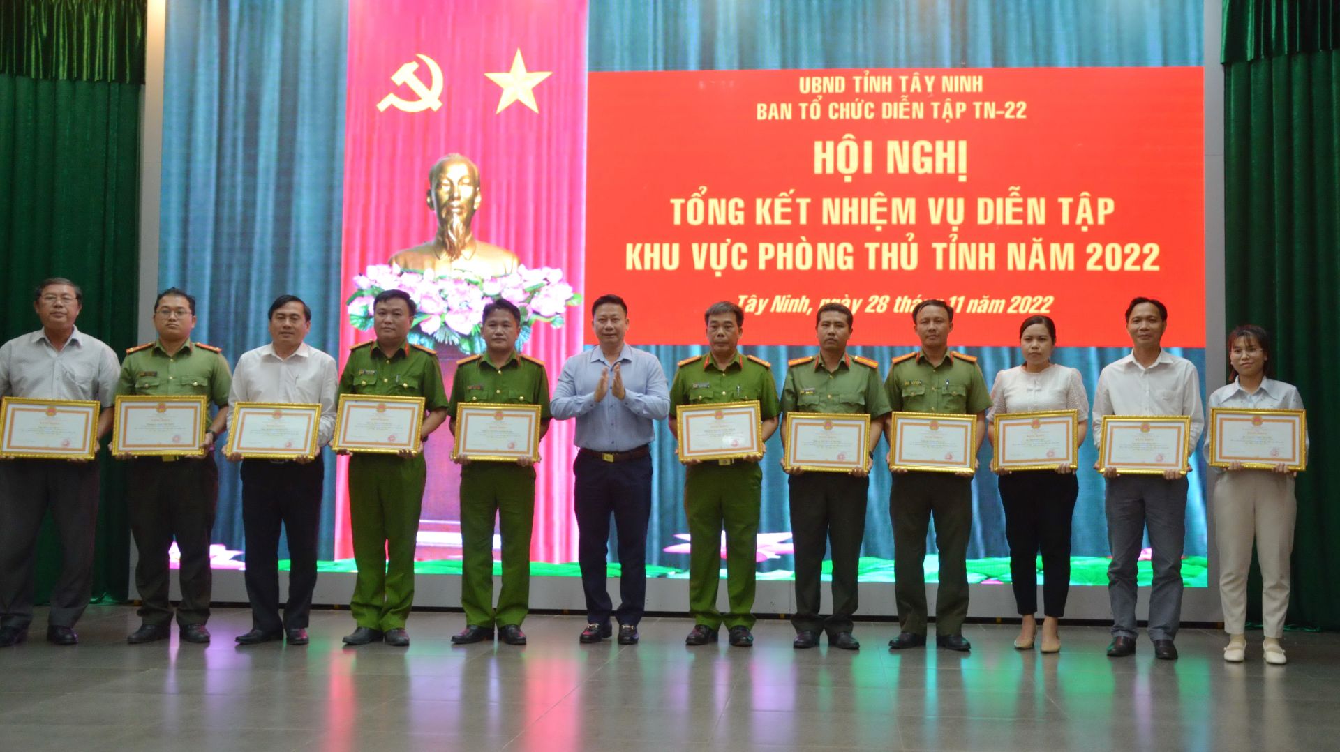 Dịp này, UBND tỉnh tặng giấy khen cho 13 tập thể và 33 cá nhân có thành tích xuất sắc trong thực hiện nhiệm vụ diễn tập khu vực phòng thủ tỉnh năm 2022.