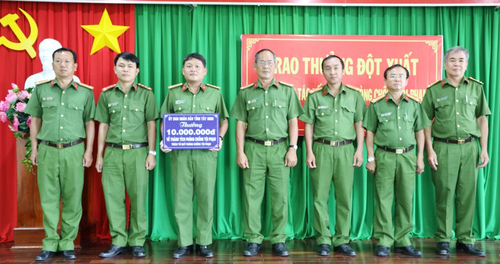 Ngày 7.10, tại Phòng Cảnh sát môi trường, thừa ủy quyền của UBND tỉnh Tây Ninh, Công an tỉnh đã trao thưởng 10 triệu đồng của UBND tỉnh cho tập thể Phòng Cảnh sát môi trường Công an tỉnh vì đã có thành tích xuất sắc trong công tác đấu tranh phòng chống tội phạm trên địa bàn tỉnh. Đại tá Lý Hồng Sinh-Phó Giám đốc Công an tỉnh chủ trì buổi lễ.
