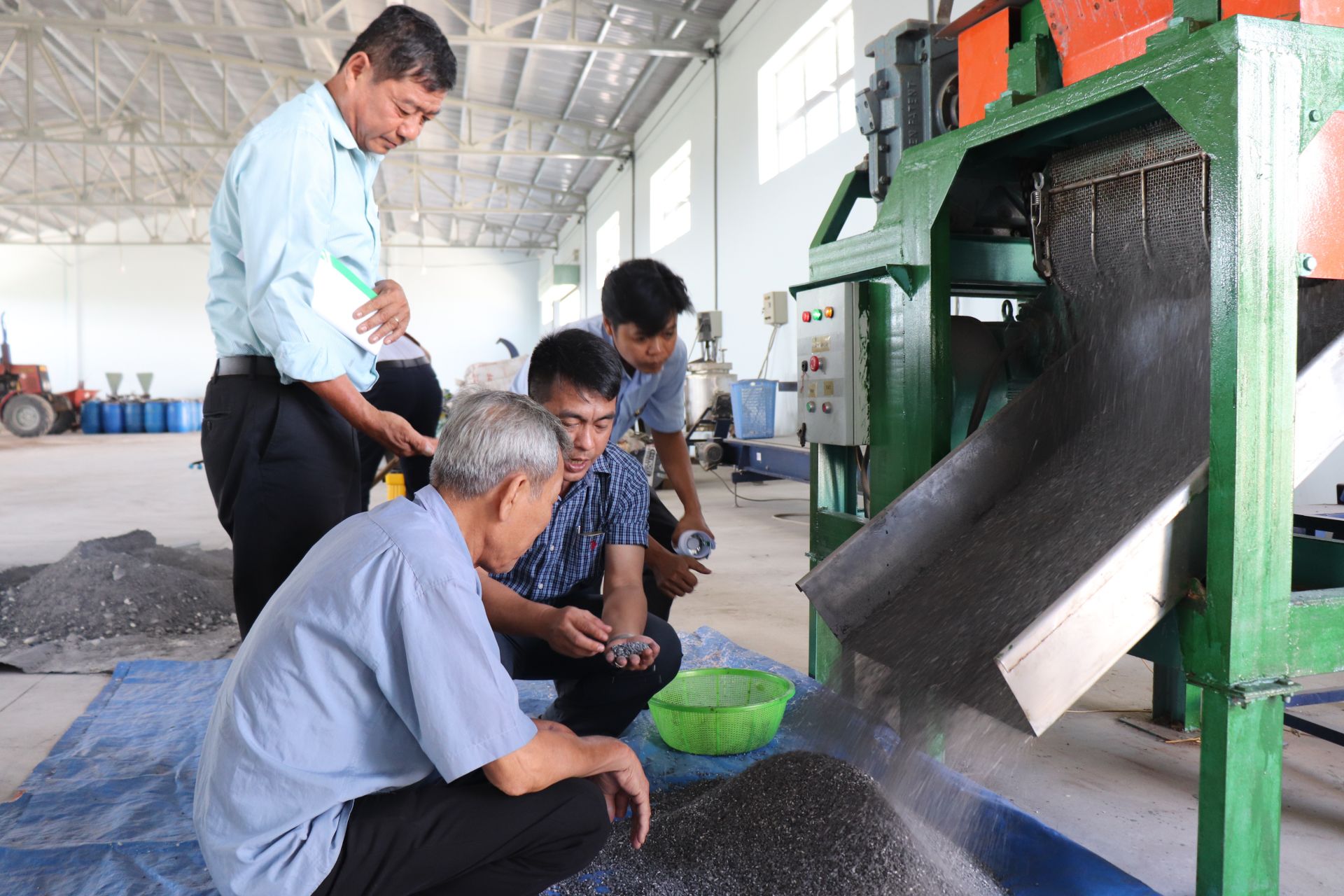 Các đại biểu xem quy trình sản xuất phân bón bổ sung 10% silica từ tro trấu bằng công nghệ ép viên không nhiệt.