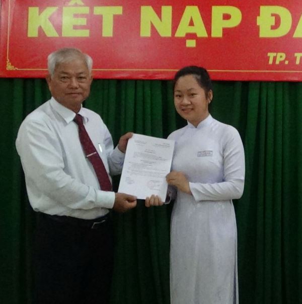 Em Trần Tuyết Minh- học sinh Trường THPT Tây Ninh nhận quyết định kết nạp Đảng.