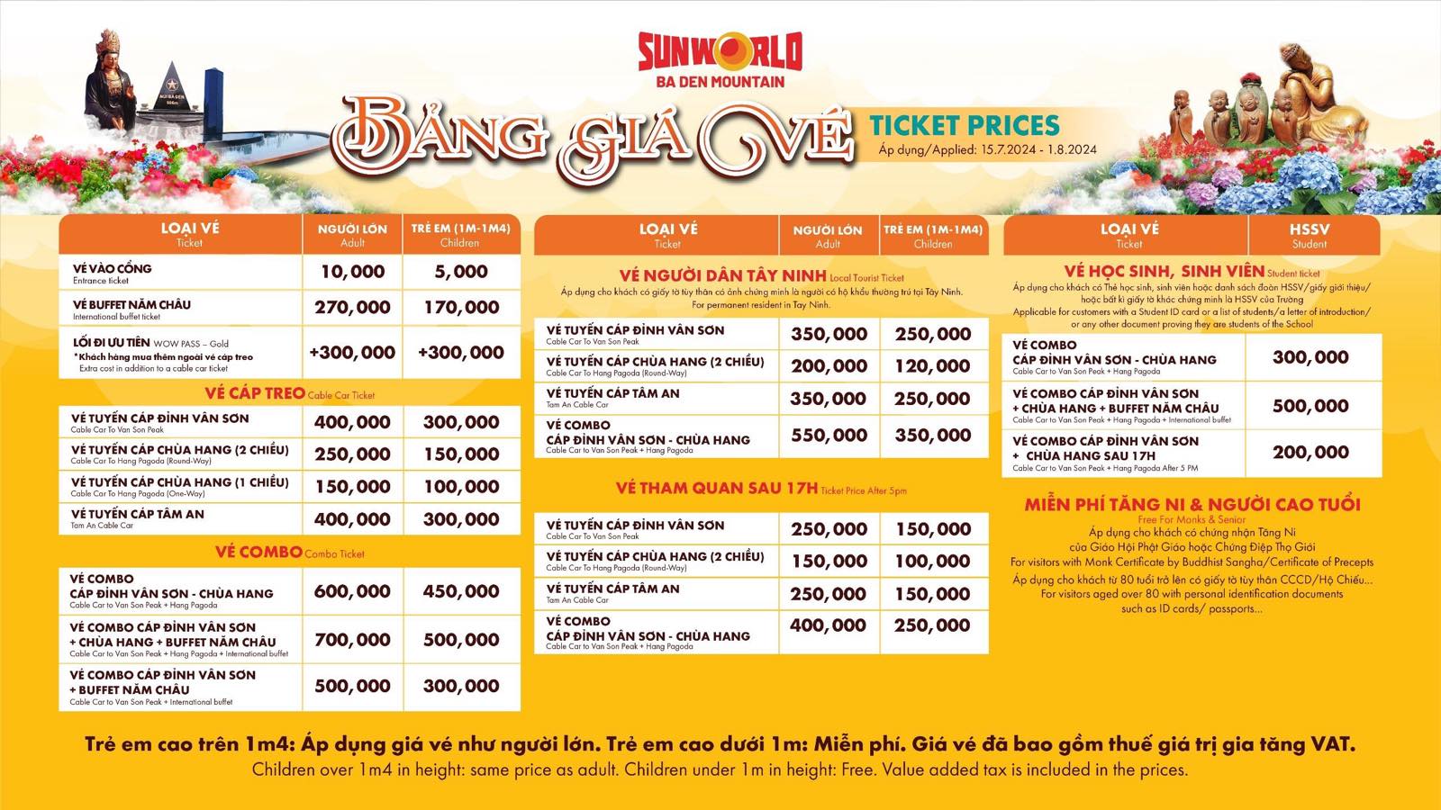 Bên cạnh ưu đãi cho học sinh sinh viên, KDL Sun World Ba Den Mountain cũng áp dụng chính sách cho người dân Tây Ninh với combo cáp lên Chùa và đỉnh còn 550.000 đồng/người lớn; Sau 17h tối, vé combo chỉ còn 400.000 đồng.