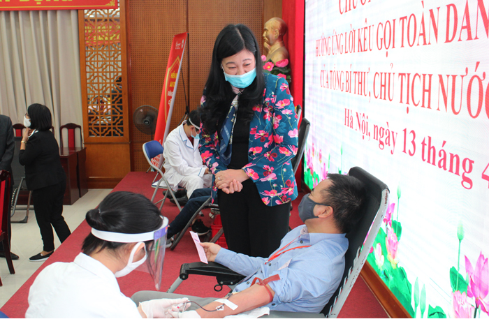 Ủy viên Ban Thường vụ Thành ủy, Chủ tịch Ủy ban Mặt trận Tổ quốc Việt Nam thành phố Hà Nội Nguyễn Lan Hương thăm hỏi người tham gia hiến máu.
