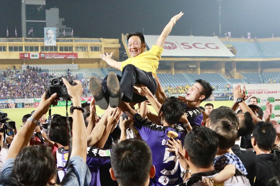 Bầu Hiển được các cầu thủ Hà Nội tung lên ăn mừng sau khi đội vô địch V.League 2018 sớm. (Ảnh: Lao động)