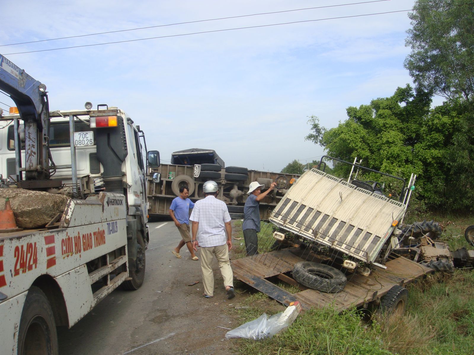 ai nạn làm xe tải lật ngang chắn gần hết đường, hàng hoá trên xe rơi tung toé. Xe máy cày cũng bị lật xuống lề đường hư hỏng nặng, người điều khiển bị chấn thương nặng ở chân. Rất may, tài xế và phụ xe tải thoát nạn.