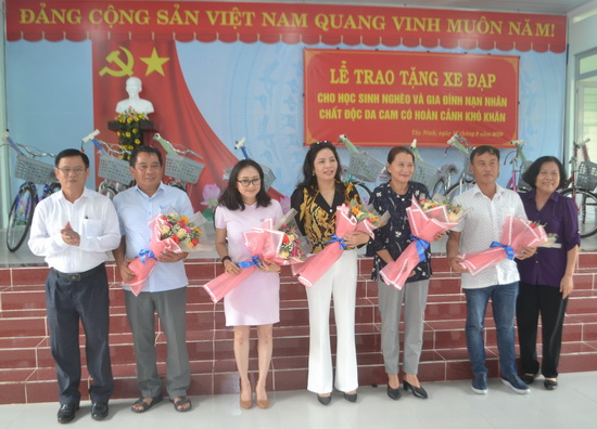 Lãnh đạo Hội NNCĐDC tỉnh và lãnh đạo huyện Dương Minh Châu tặng hoa cám ơn các mạnh thường quân.
