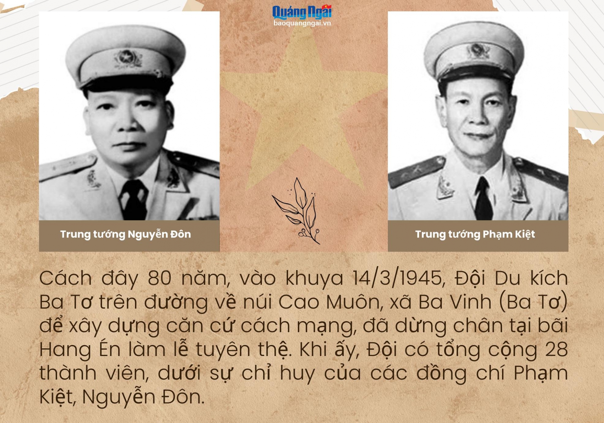 Cách đây 80 năm, vào khuya 14/3/1945, Đội Du kích Ba Tơ trên đường về núi Cao Muôn, xã Ba Vinh (Ba Tơ) để xây dựng căn cứ cách mạng, đã dừng chân tại bãi Hang Én làm lễ tuyên thệ. Khi ấy, Đội có tổng cộng 28 thành viên, dưới sự chỉ huy của các đồng chí Phạm Kiệt, Nguyễn Đôn.