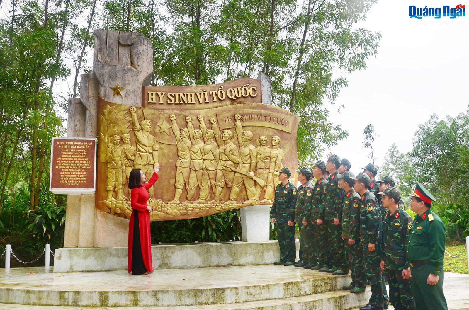 Cán bộ, chiến sĩ lực lượng vũ trang tỉnh tìm hiểu về Địa điểm di tích bãi Hang Én - nơi Đội Du kích Ba Tơ làm lễ tuyên thệ. ẢNH: HIỀN THU