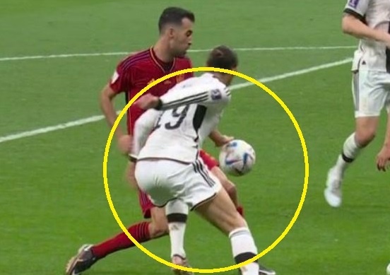 Phút 80, Leroy Sane đi bóng lắt léo trong vùng cấm trước khi thực hiện đường chuyền cho đồng đội. Tuy nhiên, trái bóng bị cản lại bởi tay của Sergio Busquets. Cầu thủ Đức phản ứng mạnh với trọng tài nhưng ông Makkelie và tổ VAR đều im lặng. Pha làm chậm chỉ rõ Busquets đã để tay chạm bóng trong vùng cấm.