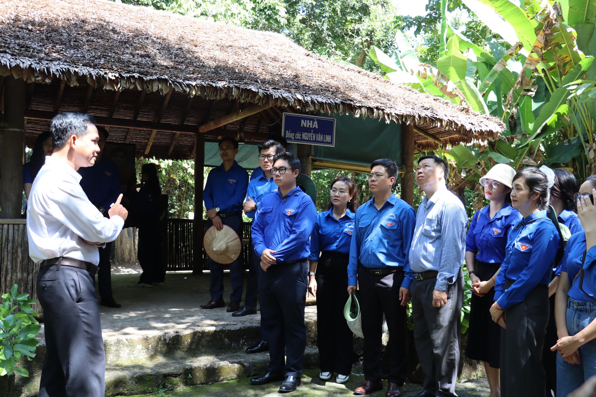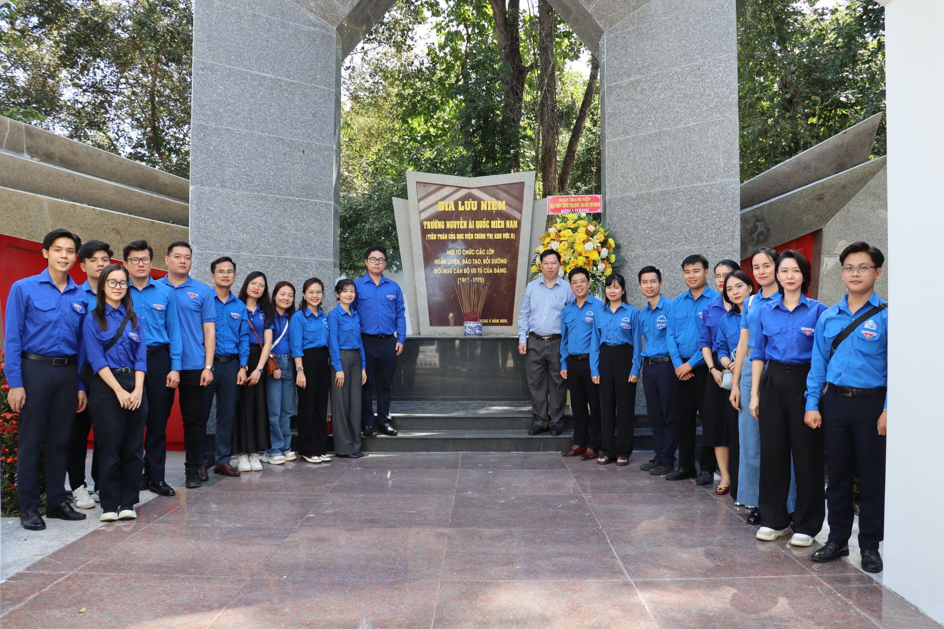 Đoàn công tác Đoàn Học viện Chính trị quốc gia Hồ Chí Minh và Đoàn Học viện Chính trị khu vực II chụp ảnh lưu niệm tại Khu di tích Trường Đảng miền Nam.