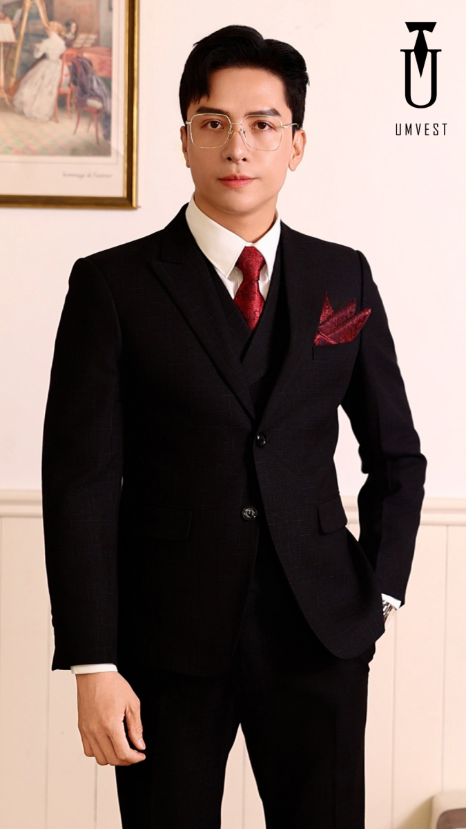 Một biến tấu độc đáo từ vest đen truyền thống. Vest đen xước là một trong những bộ vest hỗ trợ phái mạnh luôn nổi bật dù ở bất cứ đâu. Bên cạnh đó bộ vest này cũng tạo hiệu ứng ánh sáng nhẹ trên nền vải, giúp người mặc trông cao và thanh thoát hơn.