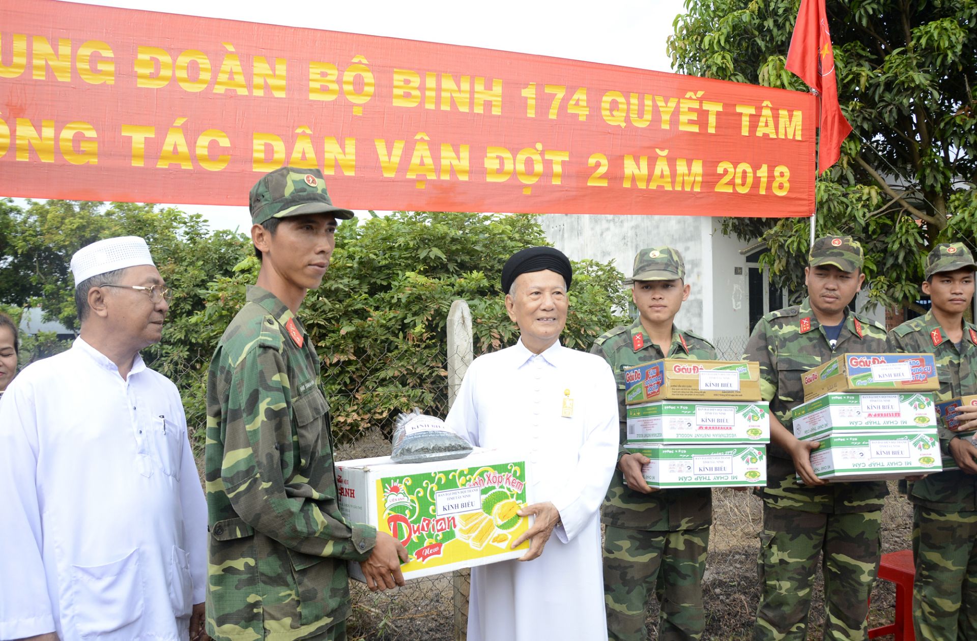 Giáo sư Thái Thọ Thanh tặng quà cho đơn vị làm công tác dân vận đợt 2.2018 xã Tân Hưng (huyện Tân Châu).
