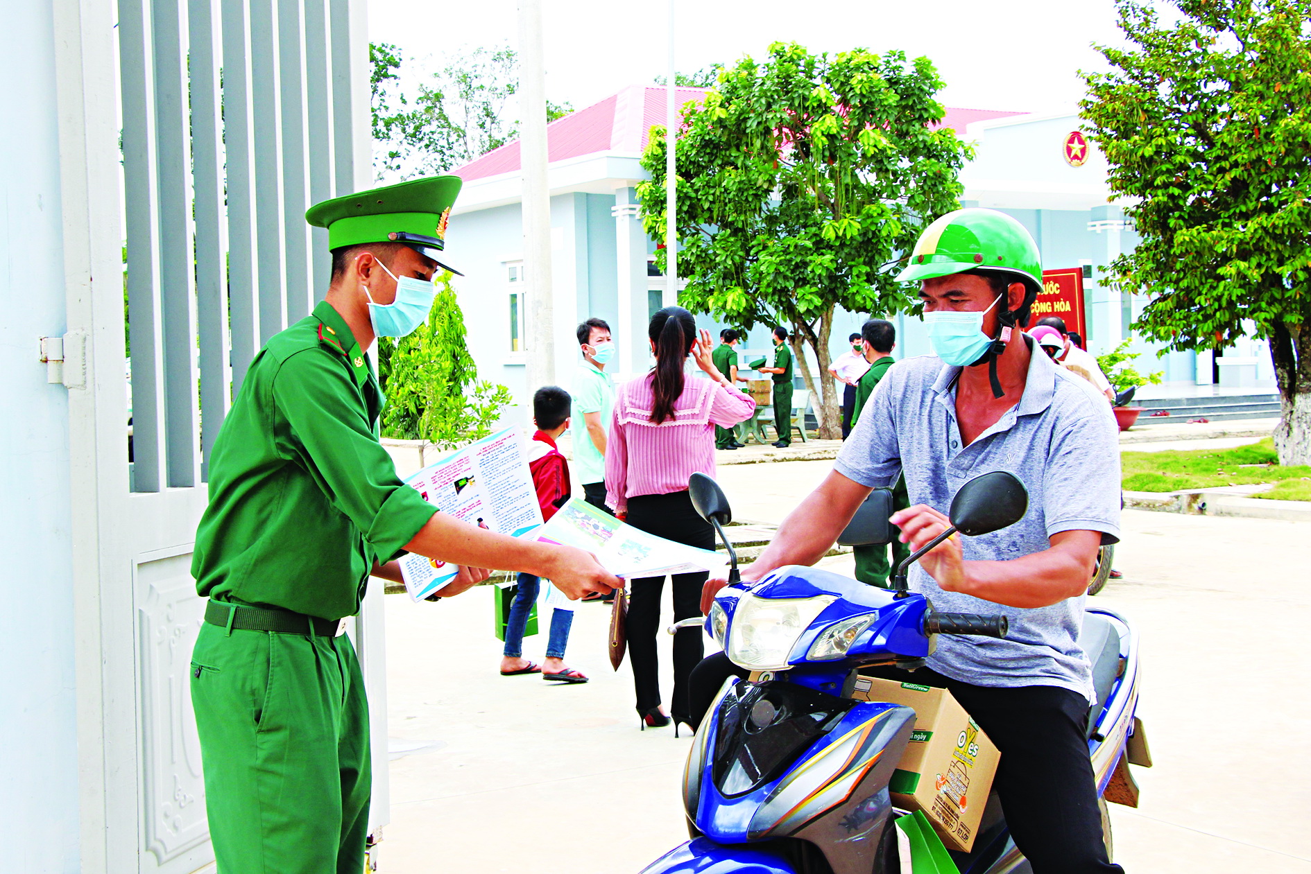 Chiến sĩ Đồn Biên phòng Phước Chỉ phát tờ rơi tuyên truyền phòng, chống dịch Covid-19 cho người dân.