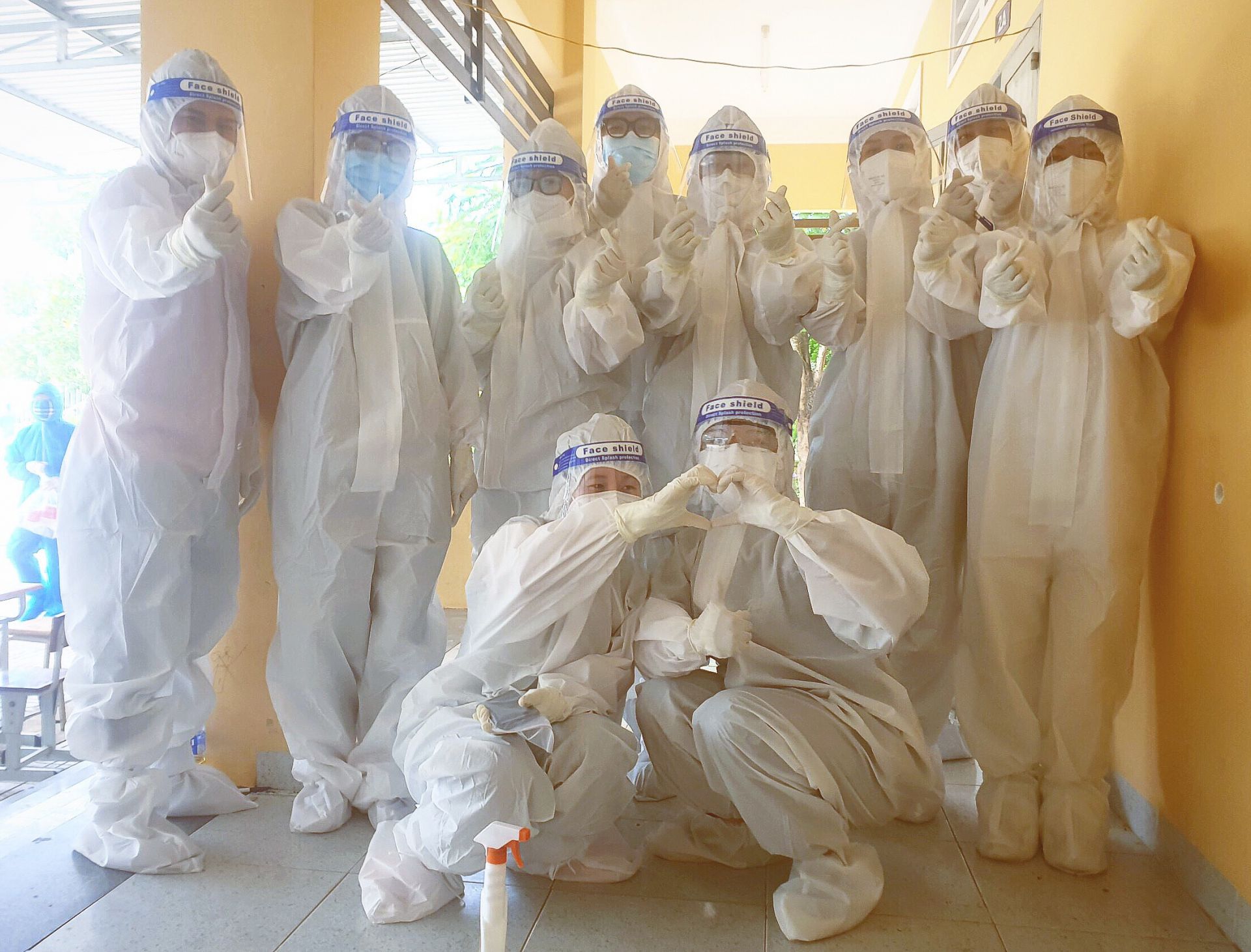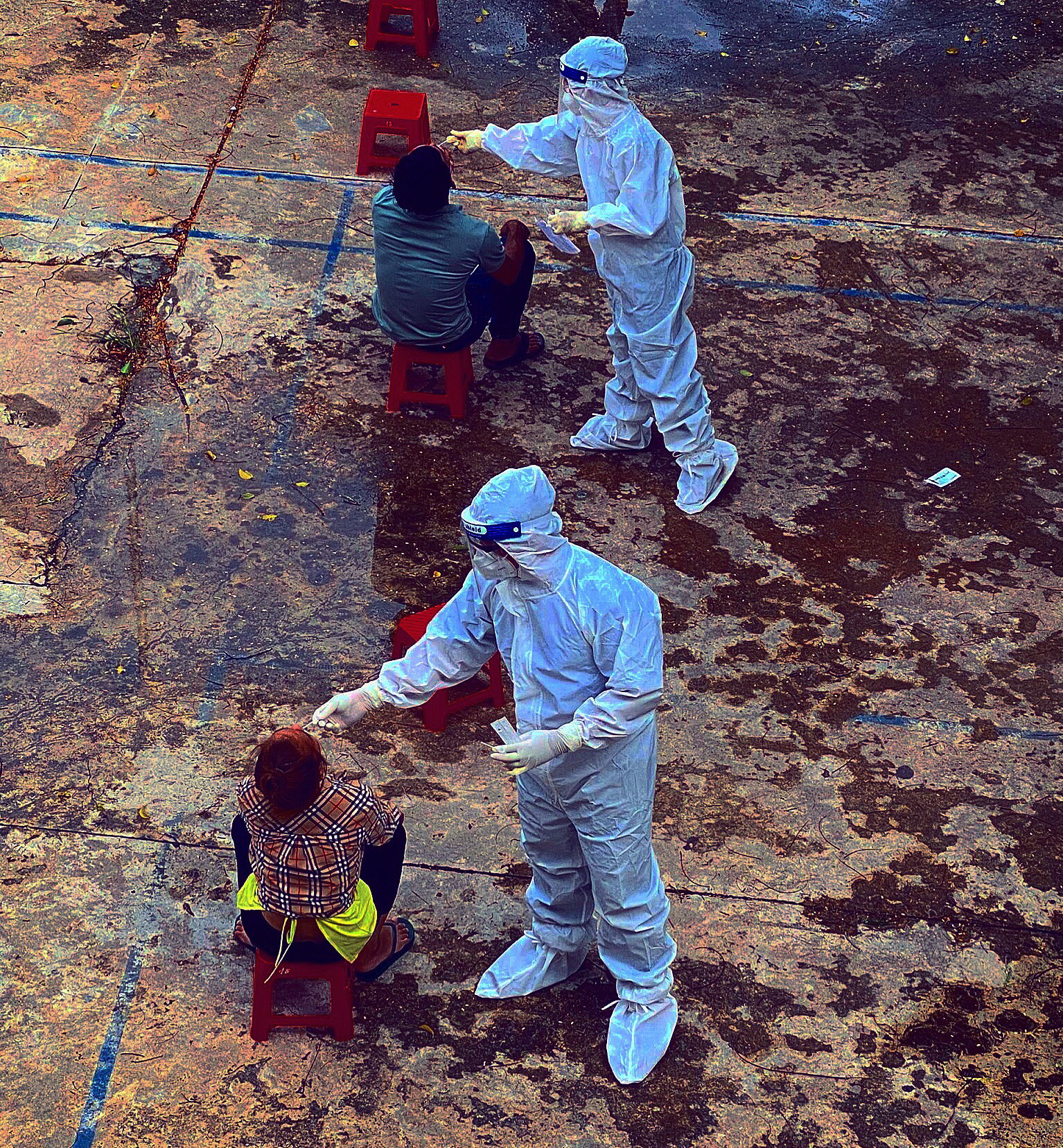 Chúng tôi được phát mỗi người 1 bộ đồ bảo hộ, làm được một lúc thì bắt đầu cảm thấy ngộp do mùi nước sát khuẩn và đổ mồ hôi vì thời tiết nắng nóng gần 37 độ. Khoảng 17 giờ hơn, mọi người hoàn tất công việc trong ngày, ai cũng thấm mệt, người thì ướt nhẹp do đổ mồ hôi, do xịt khuẩn liên tục. Hôm nay, chúng tôi thu thập hơn 400 mẫu test, trong đó 10 mẫu dương tính.
