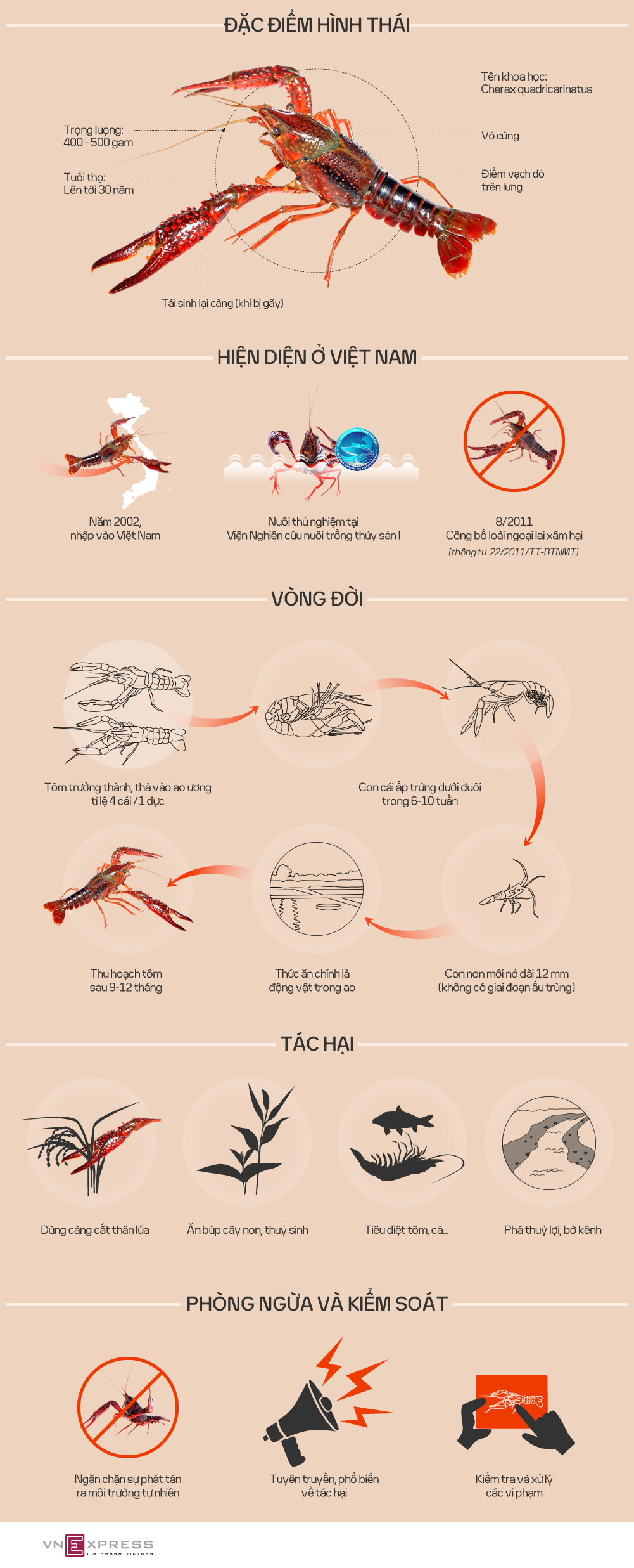 Chúng ăn tôm cá, lúa, phá hoại bờ kênh mương và có tuổi thọ cao nên nguy cơ ảnh hưởng đa dạng sinh học.